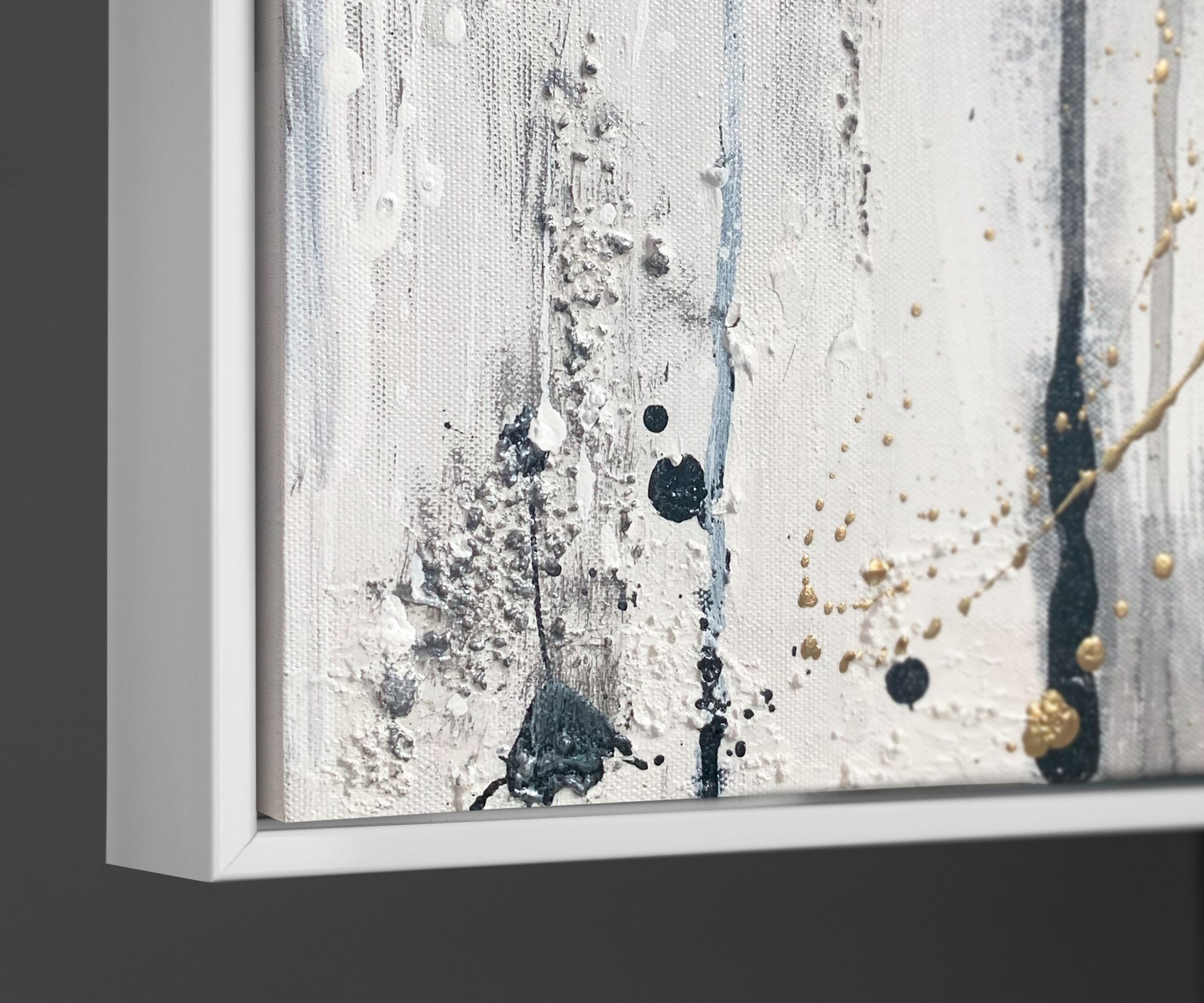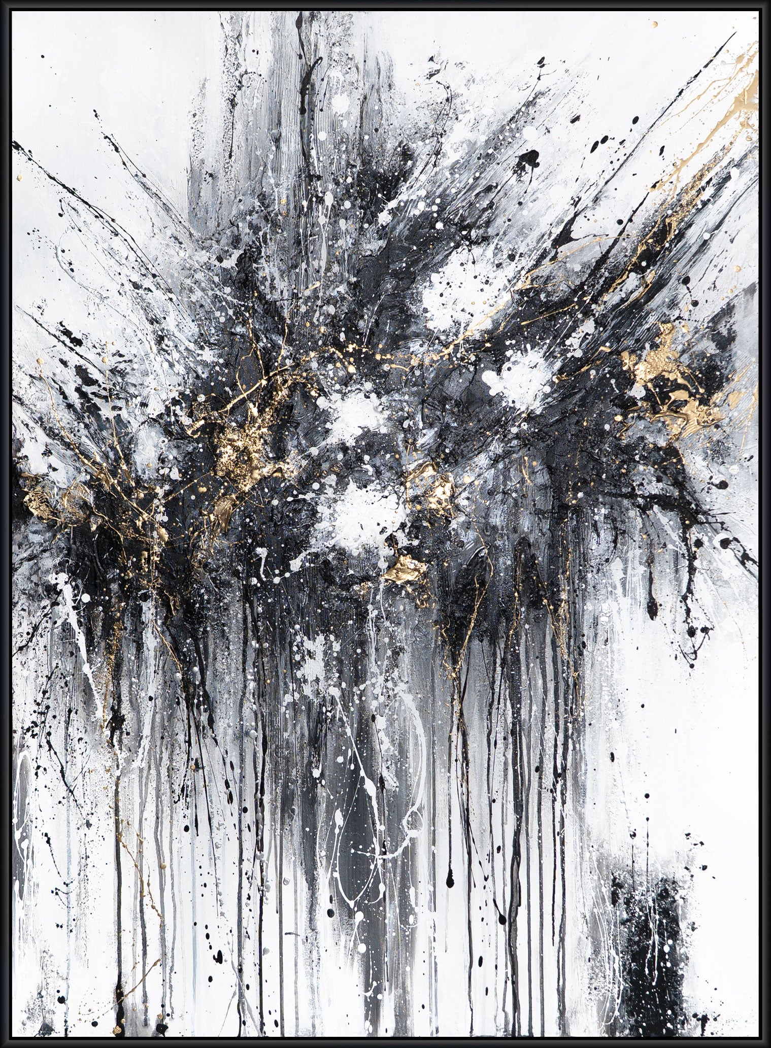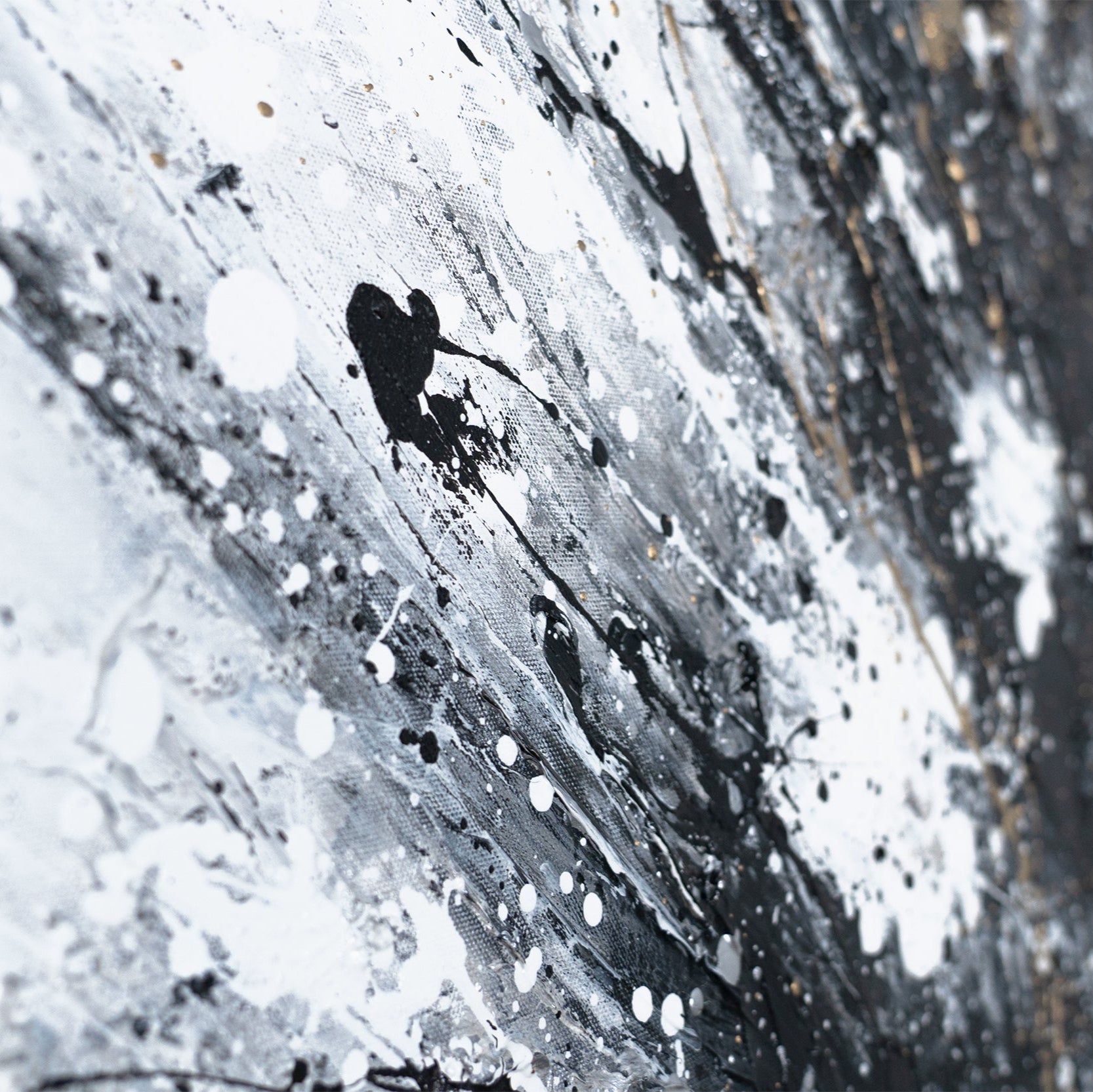 Een dynamische uitbarsting van lijnen, druppels en kleurexplosies domineert dit abstracte kunstwerk in zwart, wit en goud. Het schilderij komt over als een spontane energieontlading op het canvas – krachtig, ongecontroleerd, maar toch harmonieus in zijn interactie. De gouden accenten voegen een vleugje elegantie en diepte toe aan de compositie, terwijl het gestructureerde oppervlak het licht op verschillende manieren reflecteert.