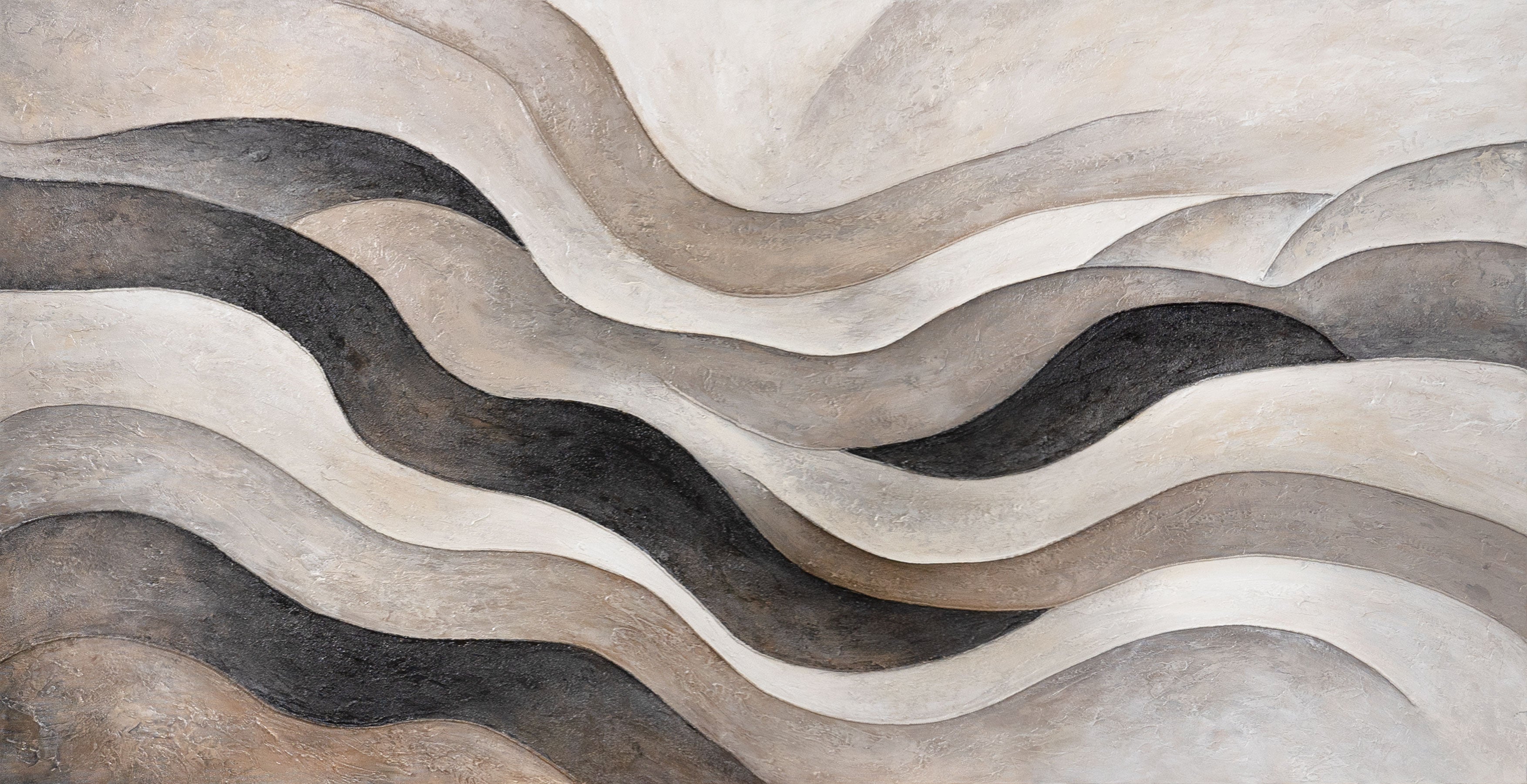 „Zandgolven” is een handgeschilderd acryl schilderij op canvas dat indruk maakt door zijn organische vormen en fijne reliëfstructuur. In zachte tinten van beige, crème, grijs en zwart ontstaan golvende lijnen die doen denken aan natuurlijke duinenlandschappen. Elke penseelstreek brengt diepte en beweging in de compositie, waardoor een harmonisch spel van licht en schaduw ontstaat.