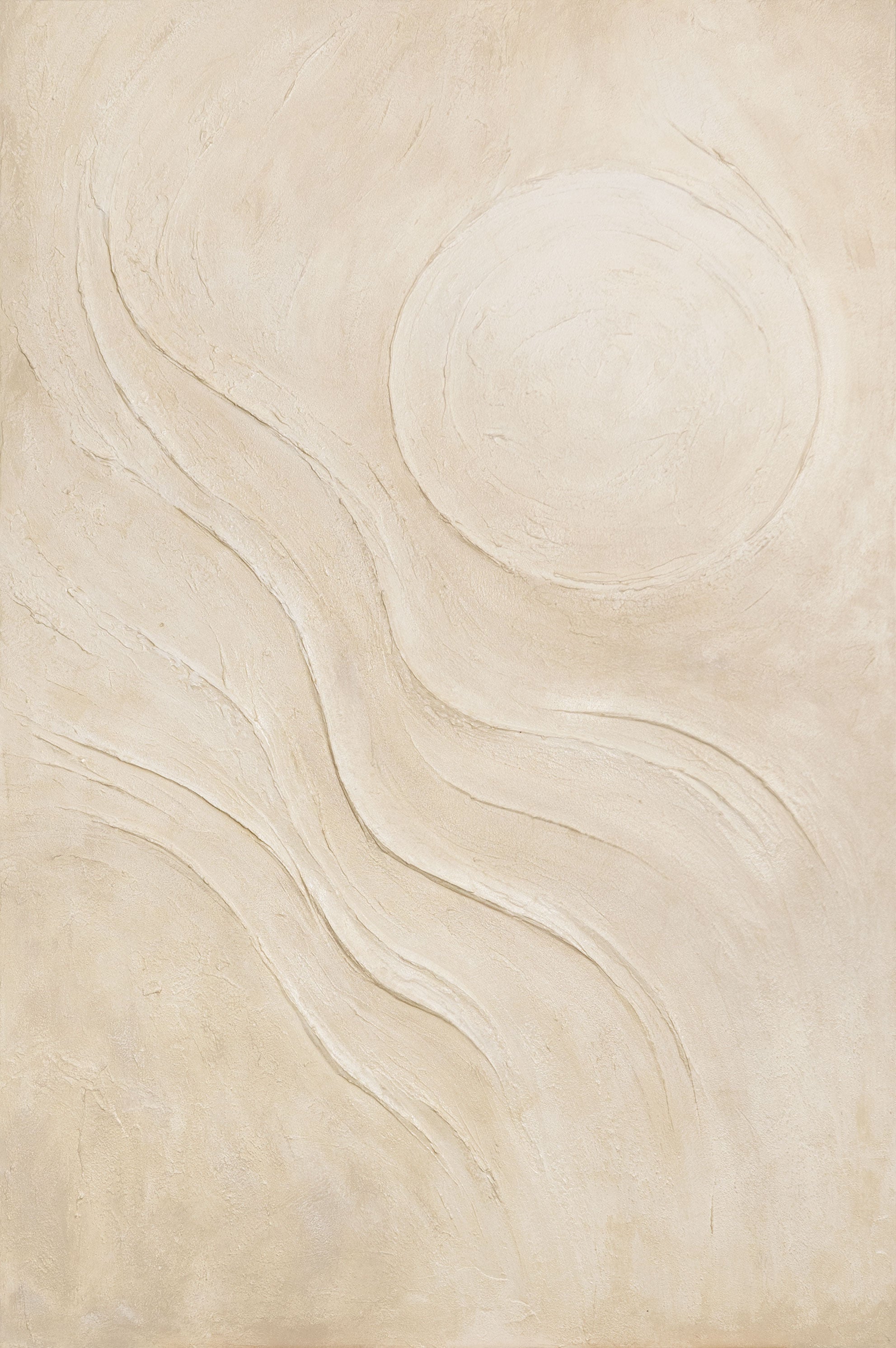 "Zandige zon" is een handgeschilderd acryl schilderij dat rust en naturaliteit uitstraalt. De zachte lijnen en lichte beigetinten doen denken aan golven in het zand en het warme licht van een stille zon. De plastische structuur creëert diepte en geeft het werk een harmonieuze, rustgevende uitstraling.