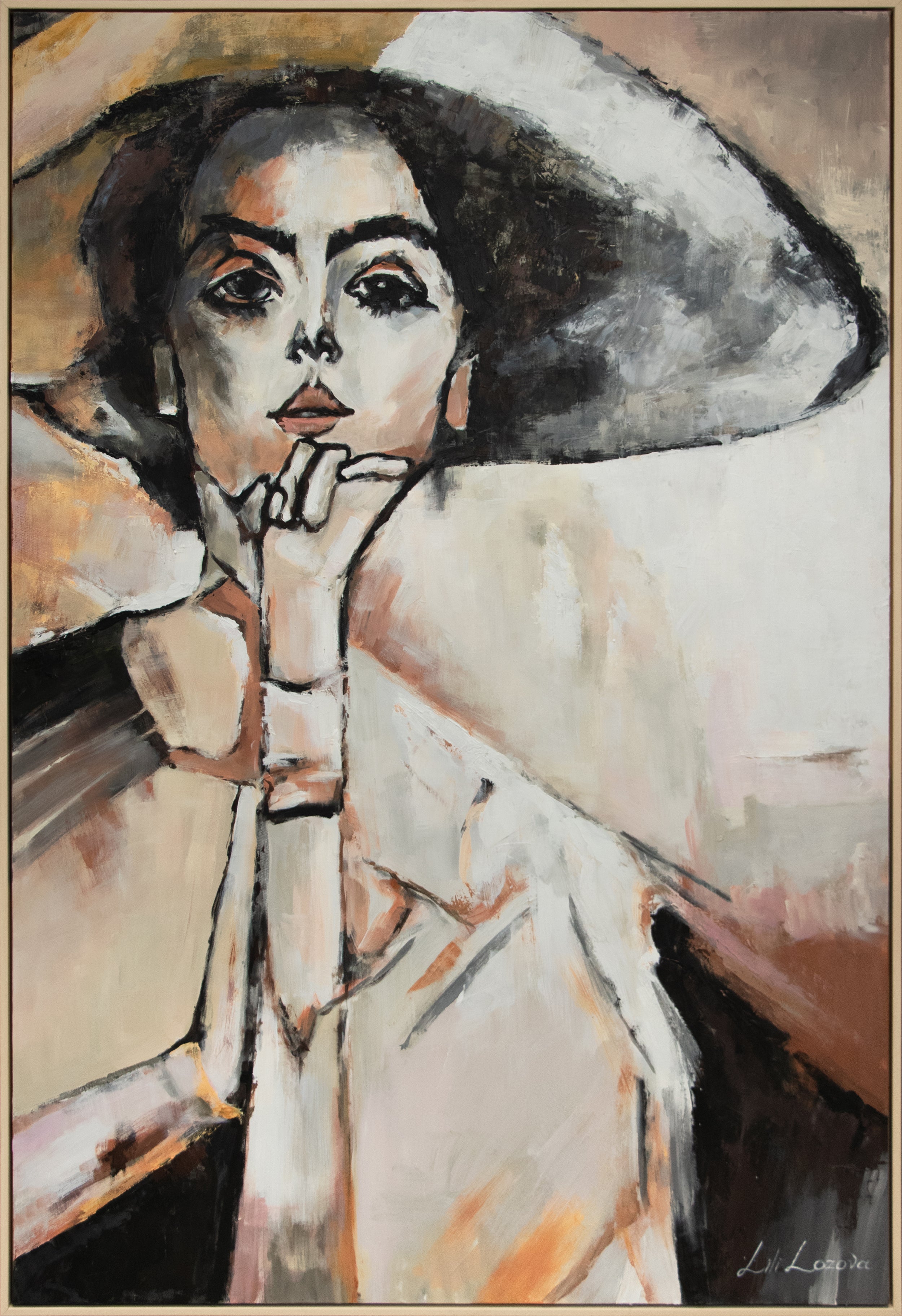 Een stijlvol, handgeschilderd acryl schilderij dat een expressieve vrouw met een brede hoed in abstracte stijl afbeeldt. Zachte beigetinten contrasteren met diep zwart en subtiele rosékleurige nuances. De zelfverzekerde blik van de figuur trekt de aandacht en geeft het schilderij een elegante, tijdloze uitstraling.