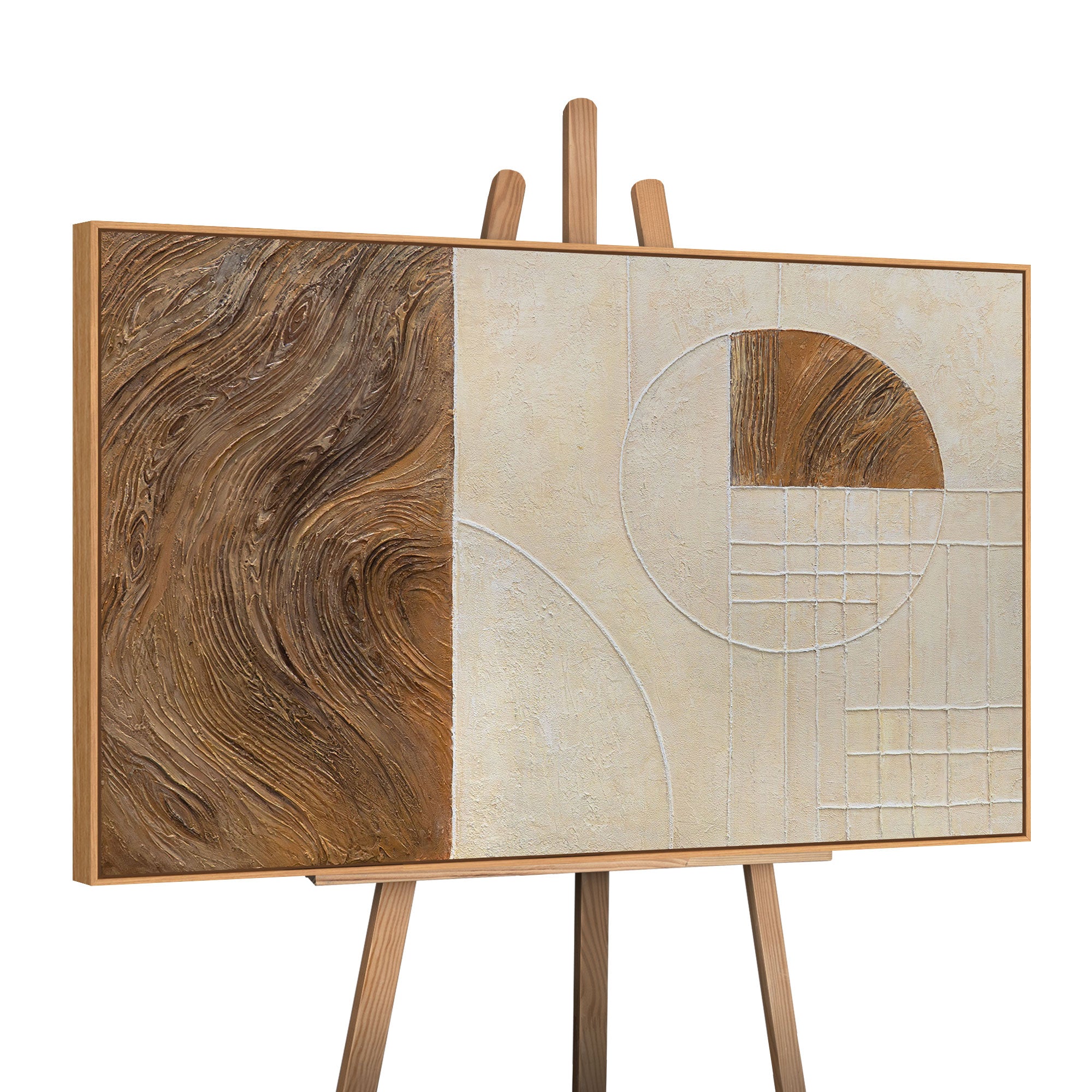 "Lines and Circles" is een spel van contrast en balans. Aan de ene kant vloeit de natuurlijke houtnerf in warme bruintinten, terwijl aan de andere kant geometrische lijnen en cirkels in een rustgevend beige verschijnen. Deze compositie verenigt natuur en architectuur, beweging en precisie – een werk dat zowel rust als dynamiek belichaamt.