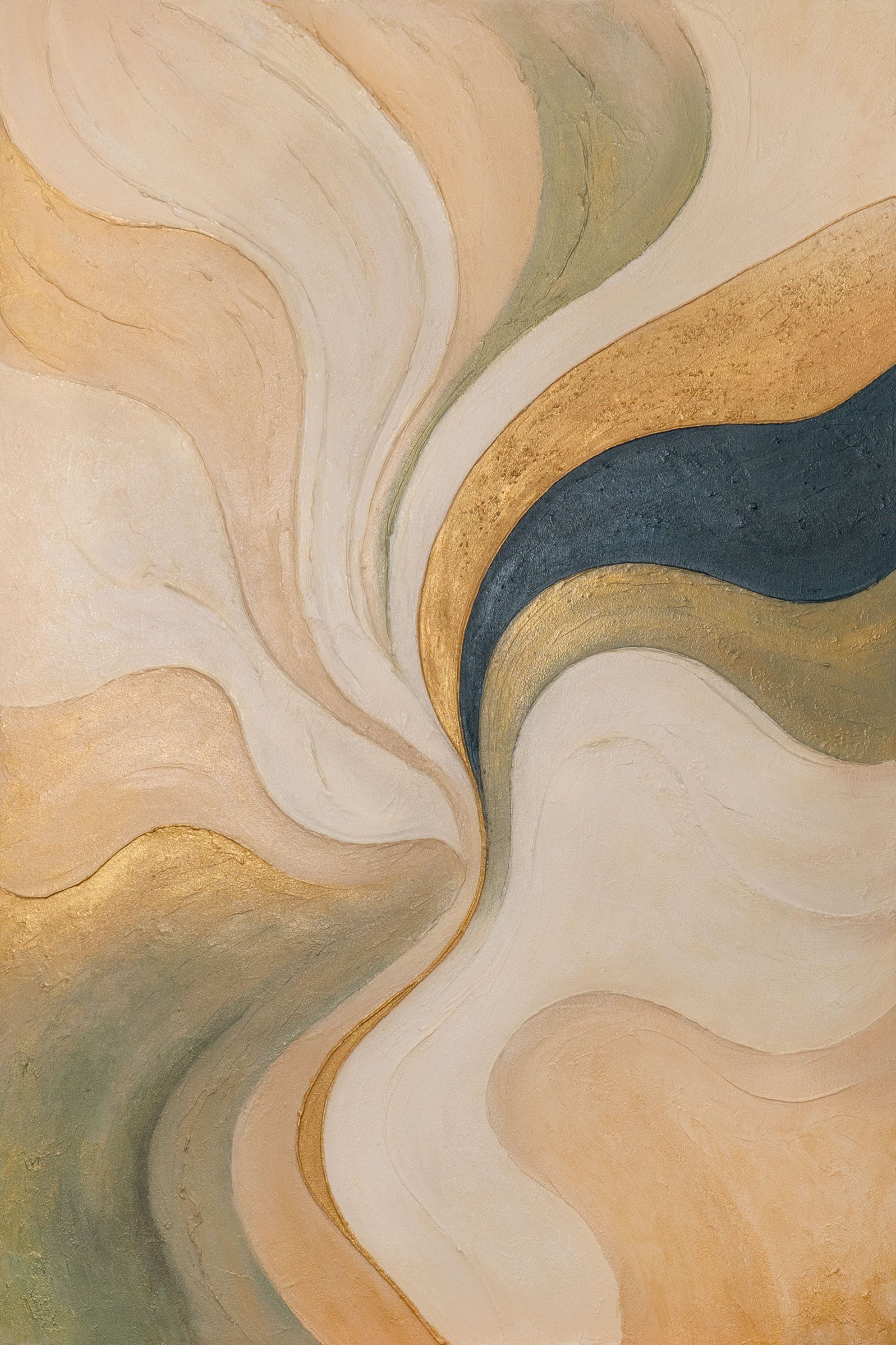 „Echo van de Wind“ is een harmonieus, handgeschilderd acrylschilderij, dat zich kenmerkt door vloeiende vormen en zachte kleurovergangen. Beige-, groen- en blauwtinten vloeien in elkaar over en worden benadrukt door gouden accenten die het werk elegantie en uitstraling geven. De reliëfstructuur benadrukt de diepte en levendigheid, waardoor het schilderij een exclusieve blikvanger wordt.