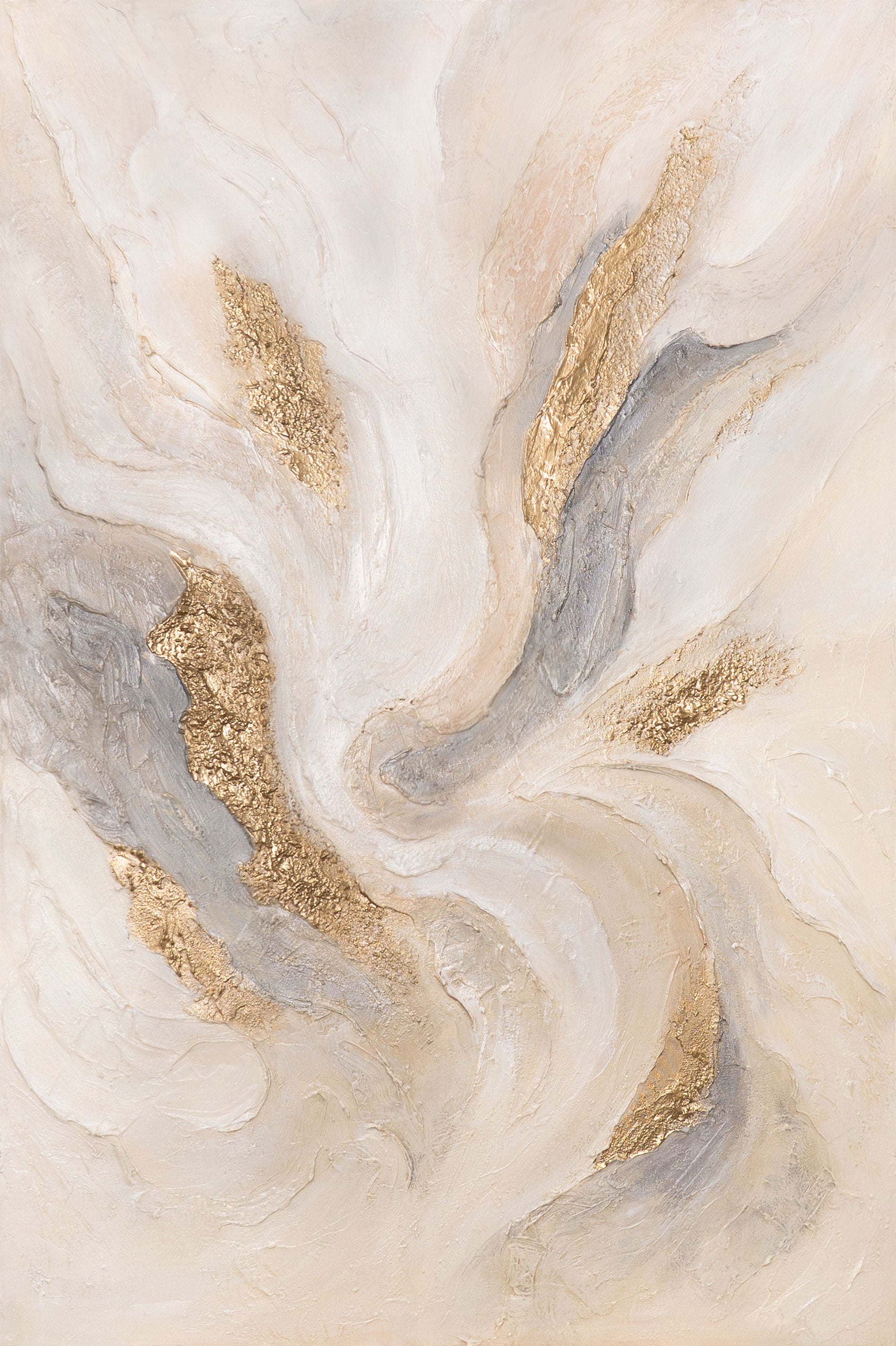 Het acryl schilderij „Stralende Stromen“ fascineert met dynamische wervelingen in zacht beige en grijs, doorkruist door stralende gouden accenten. Het reliëf op het oppervlak creëert diepte en beweging, waardoor het werk een luxueuze en levendige uitstraling krijgt.
