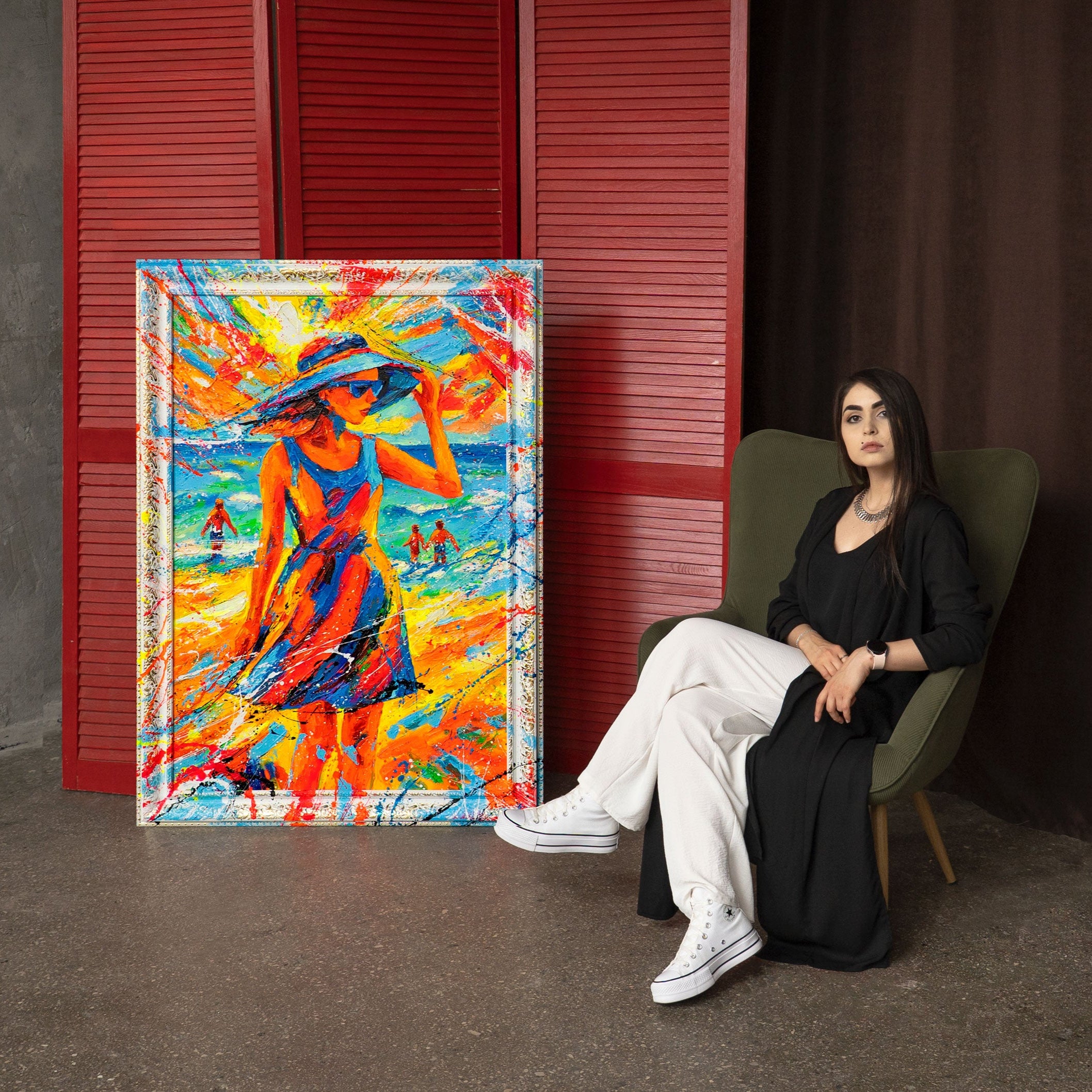 „Zomerse Gratie“ vangt de lichtheid en elegantie van een zomerse dag: Een vrouw in een kleurrijke jurk, met een zonnenhoed en bril, staat aan de zee, terwijl achter haar golven, zon en licht exploderen. De levendige kleuren – blauw, oranje, rood en geel – stralen energie, vrijheid en vakantiegevoel uit. Elke penseelstreek is handgeschilderd, elke kleurspoor een uitdrukking van artistieke kracht.
