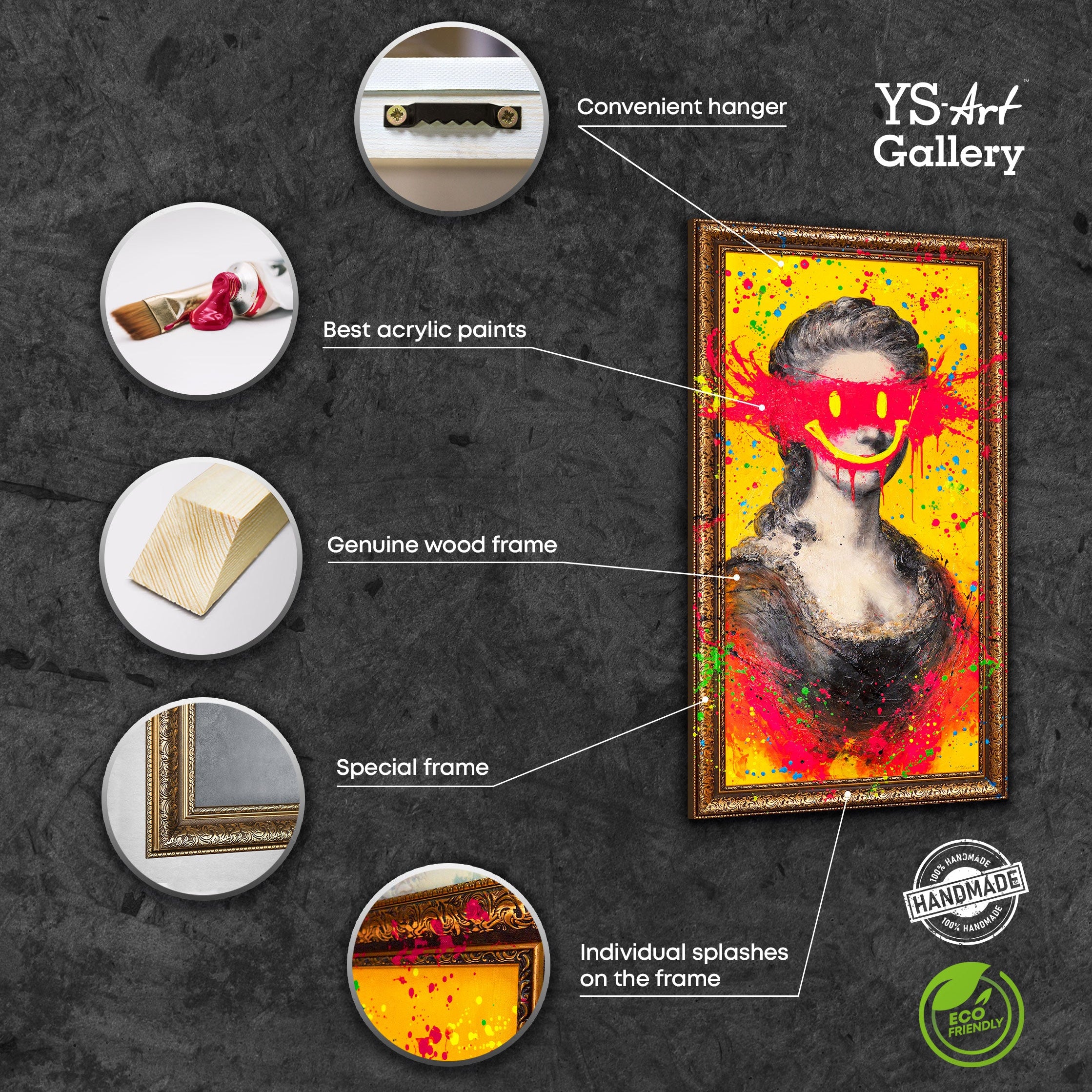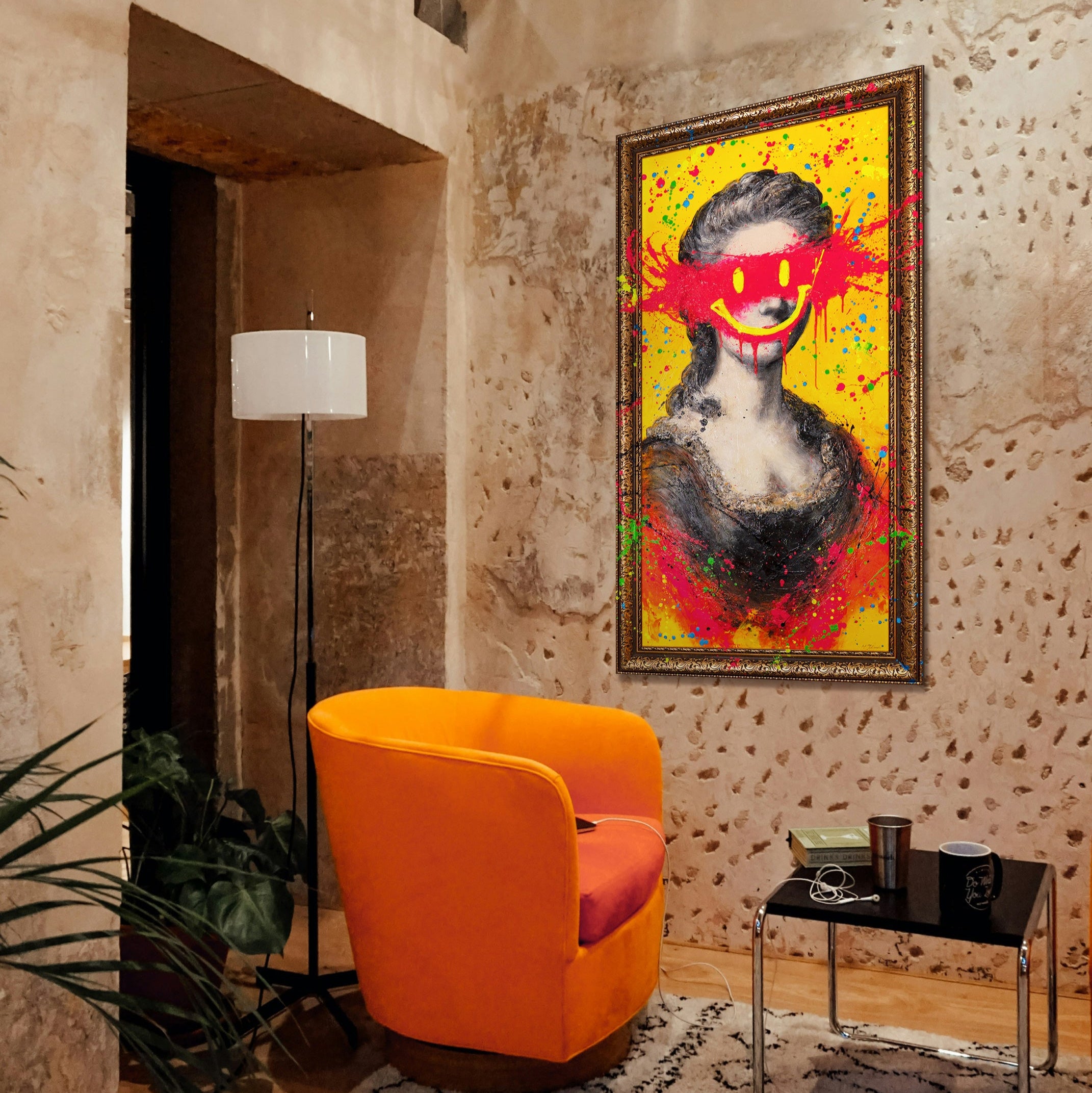 „Madame“ combineert klassieke elegantie met rebelse street-art. Op een zonnig gele achtergrond verschijnt een traditioneel vrouwenportret in zwart-wit, overlapt met een knallige rode smiley-tag. Verfspatten in blauw, groen en geel breken het beeld op en maken het tot een provocerende pop-art icoon.