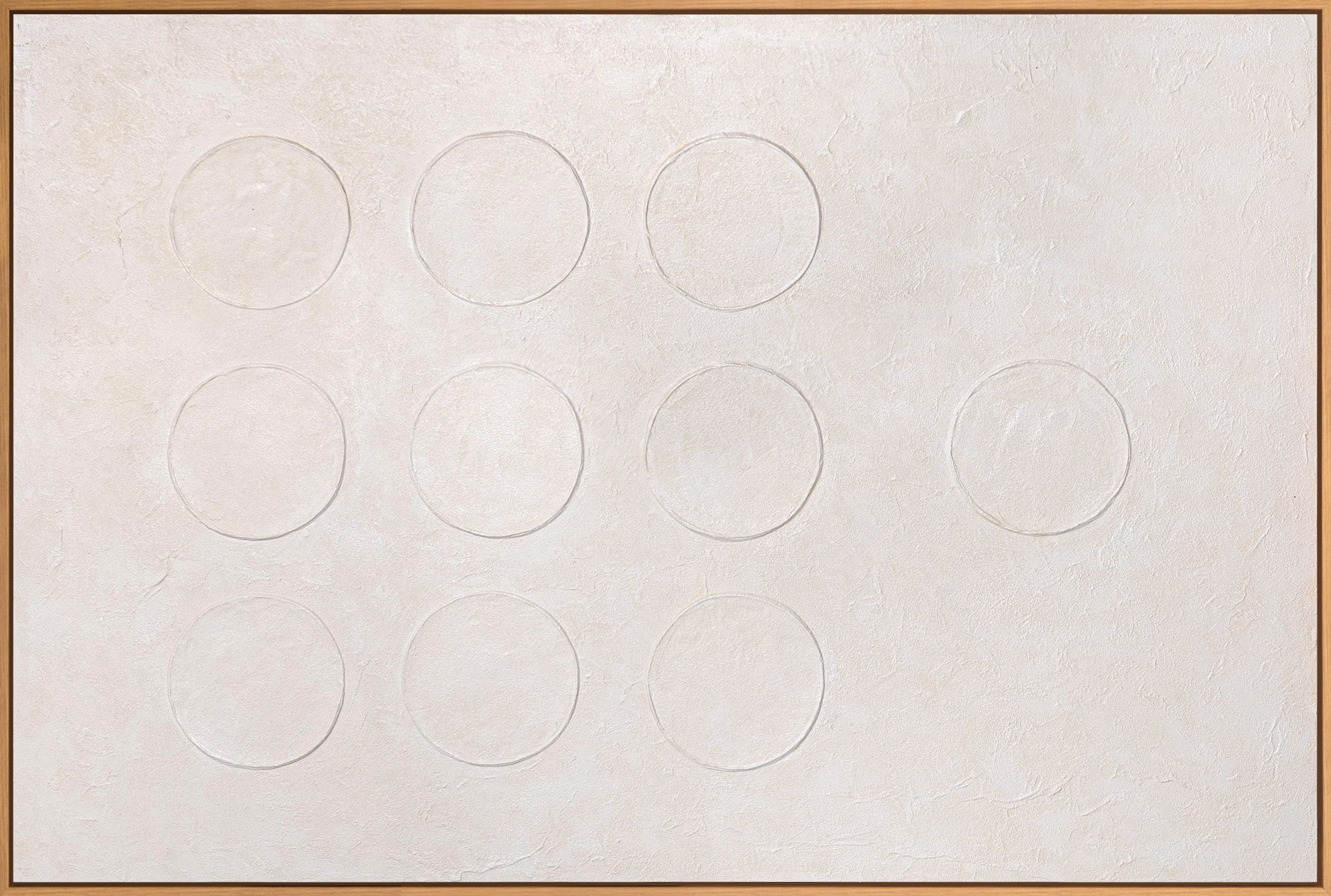"White Code" is een minimalistisch abstract acrylschilderij met subtiele cirkelvormen, een fijne textuur en een rustig wit kleurenpalet. De ingetogen reliëfs creëren diepte en orde zonder visueel dominant te zijn.