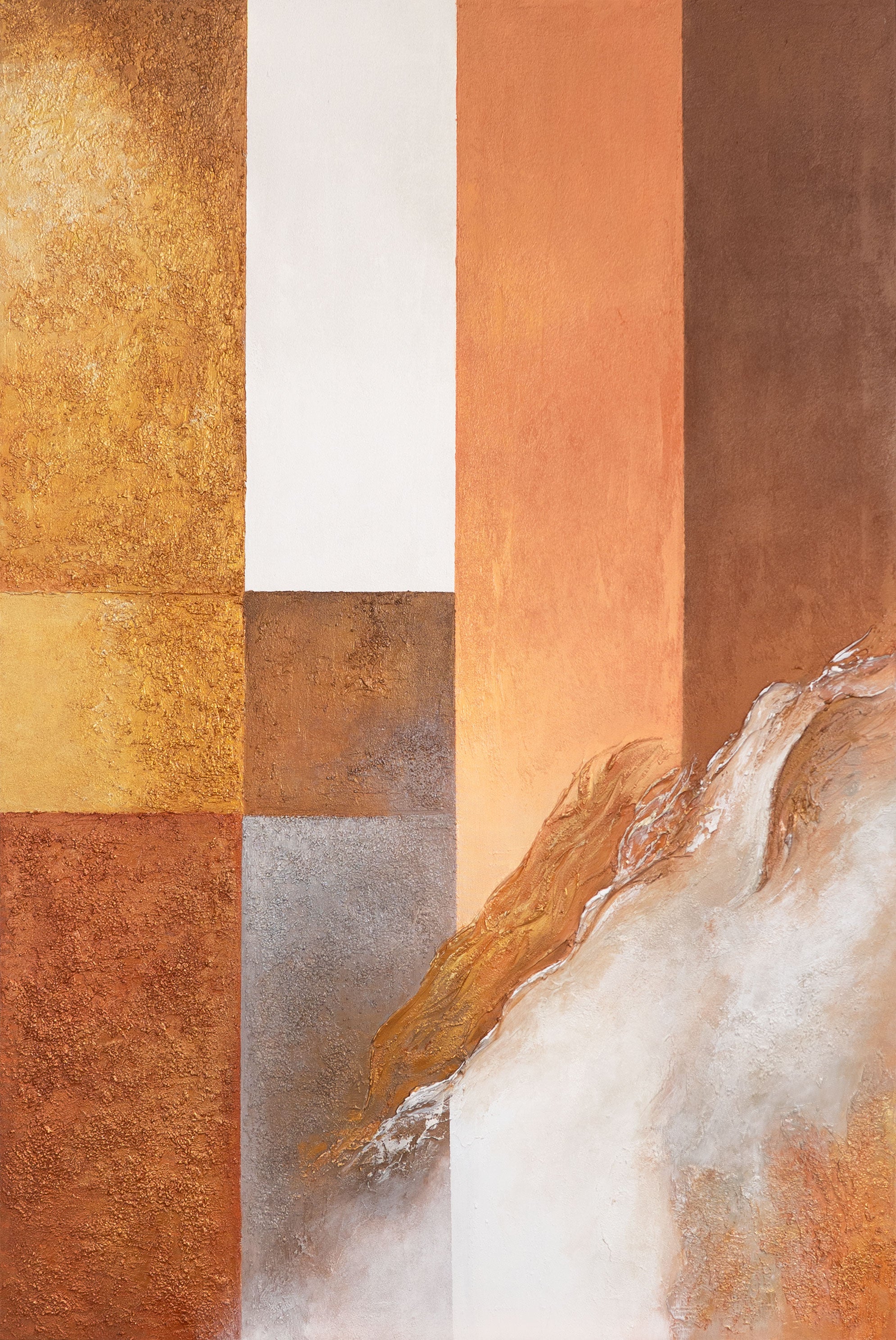 "Harmonie van vormen" is een handgeschilderd acryl schilderij dat indruk maakt door de combinatie van geometrische structuren en zachte kleurverlopen. Het palet van warm oranje, goud, bruin en subtiele natuurtinten geeft het werk diepte en een edele glans. Het reliëfachtige oppervlak versterkt het artistieke karakter en maakt elk vlak op unieke wijze ervaarbaar.