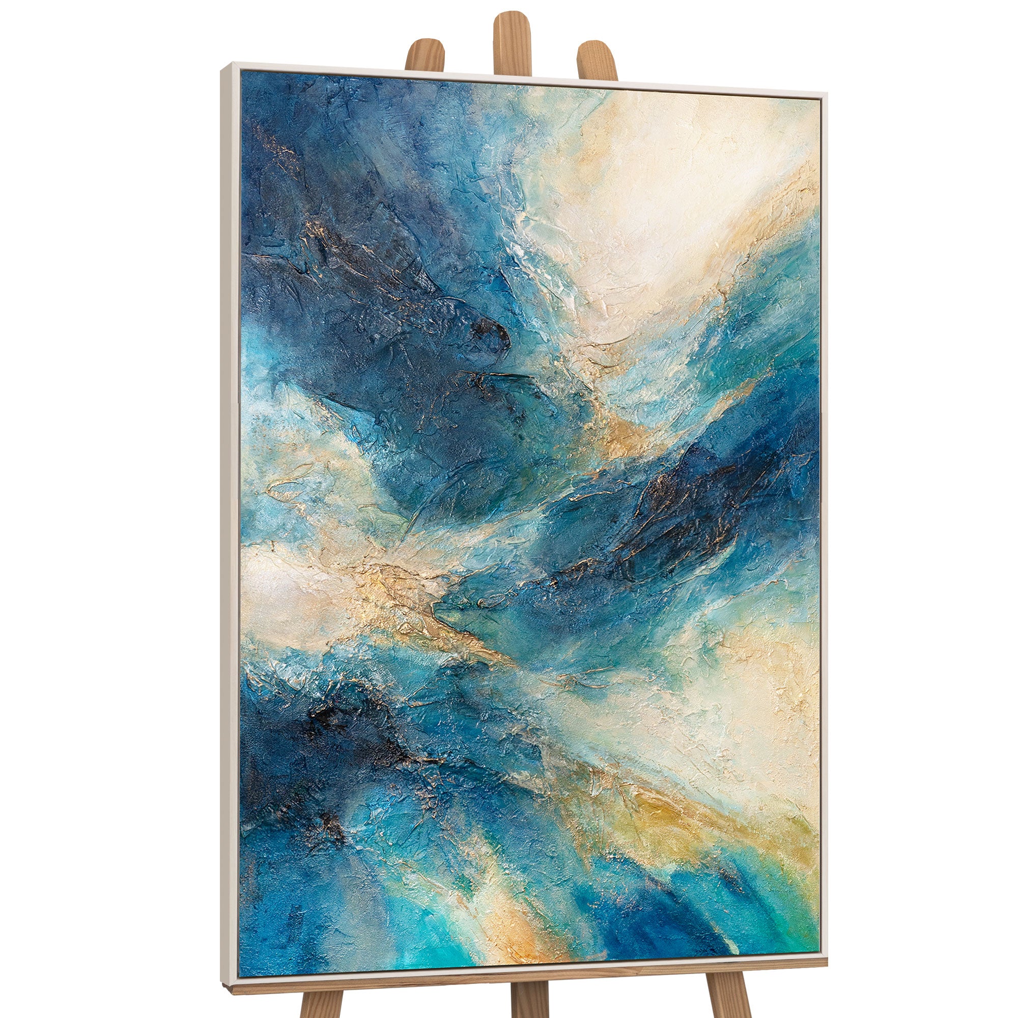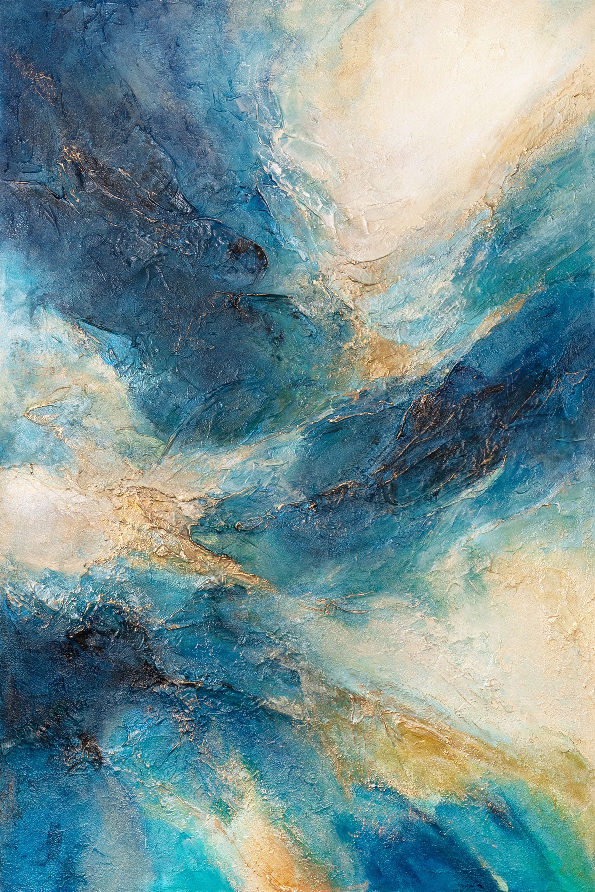 Duik in de diepte van de oceaan met het handgeschilderde canvas schilderij „Gloed van de Golven”. Krachtige blauwtinten versmelten met zacht wit en gouden accenten die lijken op lichtreflecties op het wateroppervlak. Het gestructureerde oppervlak geeft het schilderij diepte en dynamiek, waardoor het een echte blikvanger wordt.