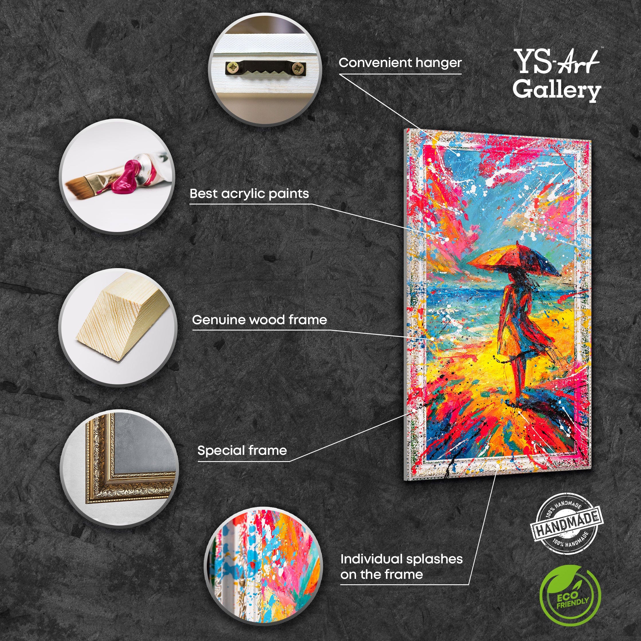"Sonne entgegen" is een handgeschilderd acryl schilderij vol intensiteit, beweging en hoop. De scène toont een vrouw met een parasol aan de zee, omgeven door levendige kleuren die samenvloeien als zonnestralen en golven. De krachtige kleurexplosie in rood, geel, blauw en roze brengt warmte, dynamiek en levensvreugde rechtstreeks in uw ruimte.