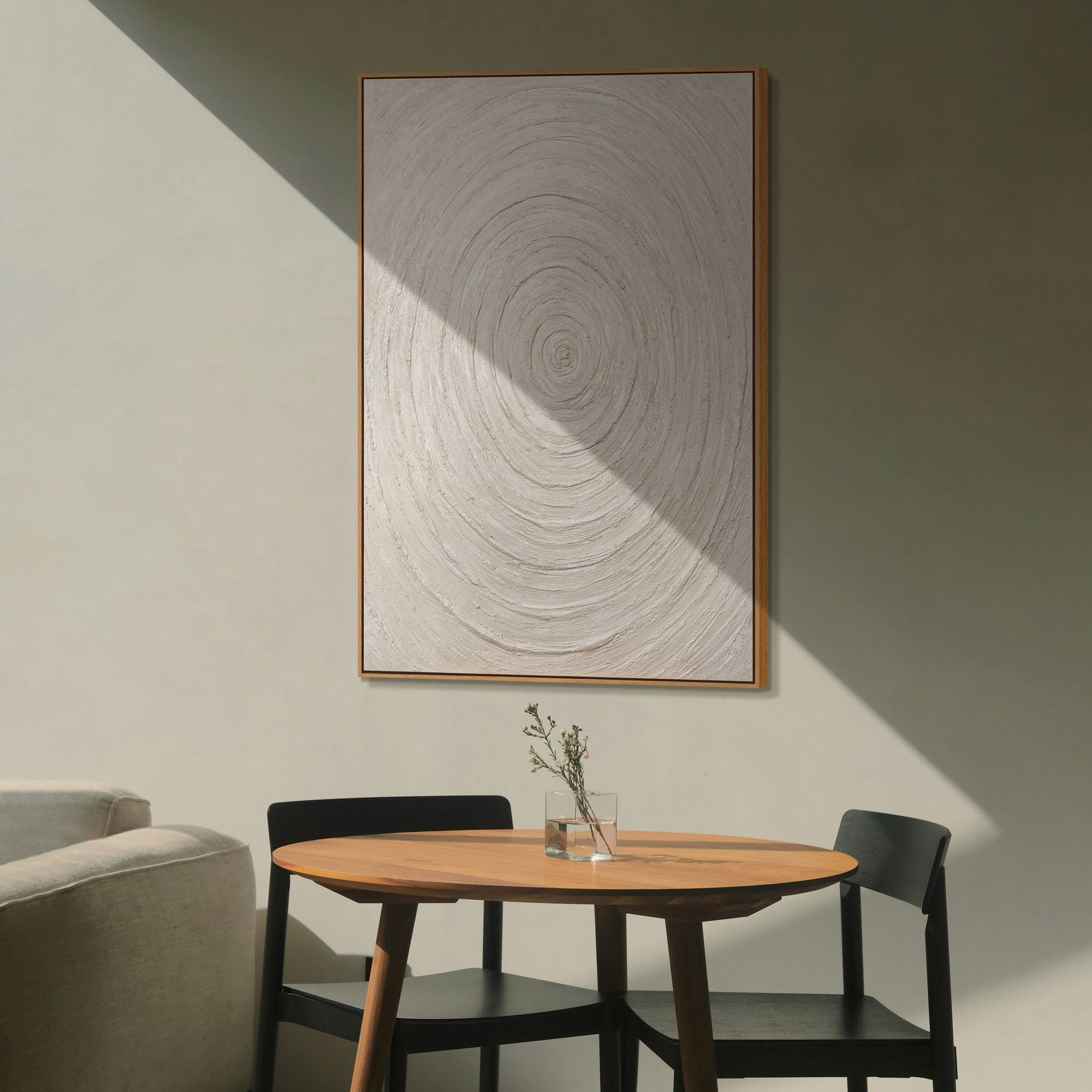 Het moderne structuur schilderij past perfect in minimalistische, Scandinavische en eigentijdse woonstijlen. Het creëert een edele en meditatieve sfeer in de woonkamer, slaapkamer of kantoor.