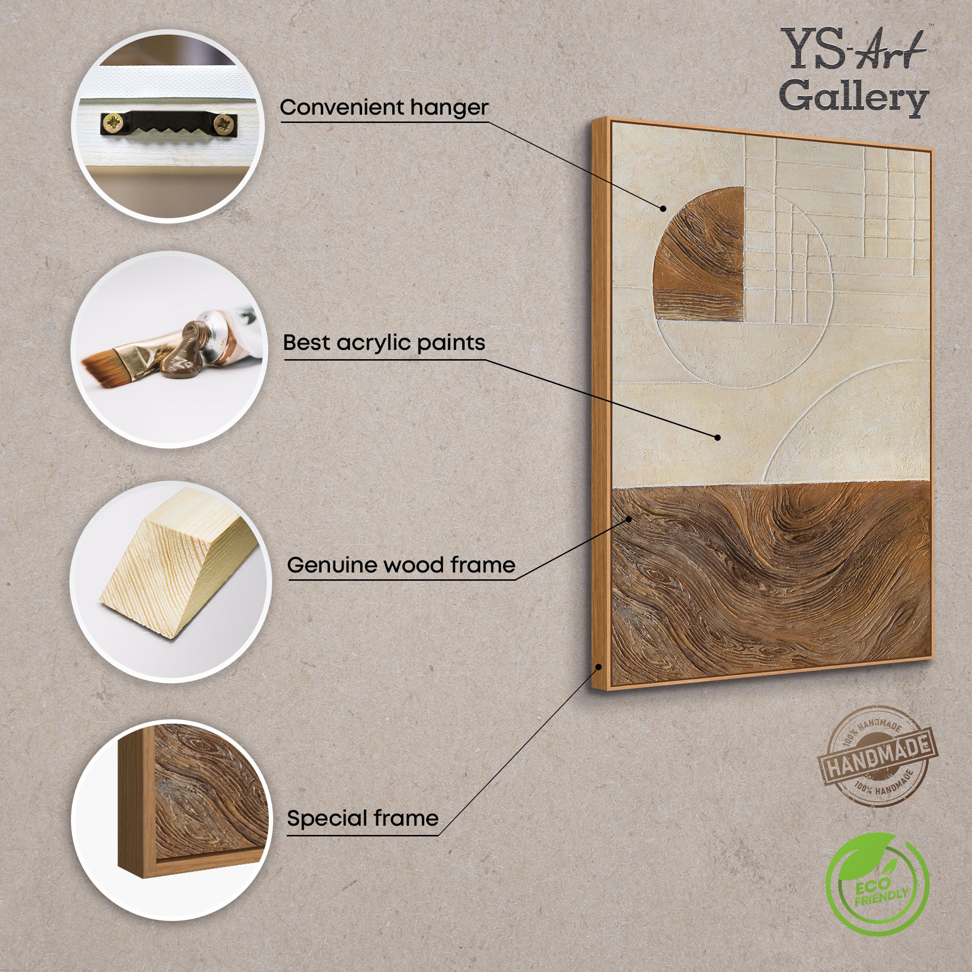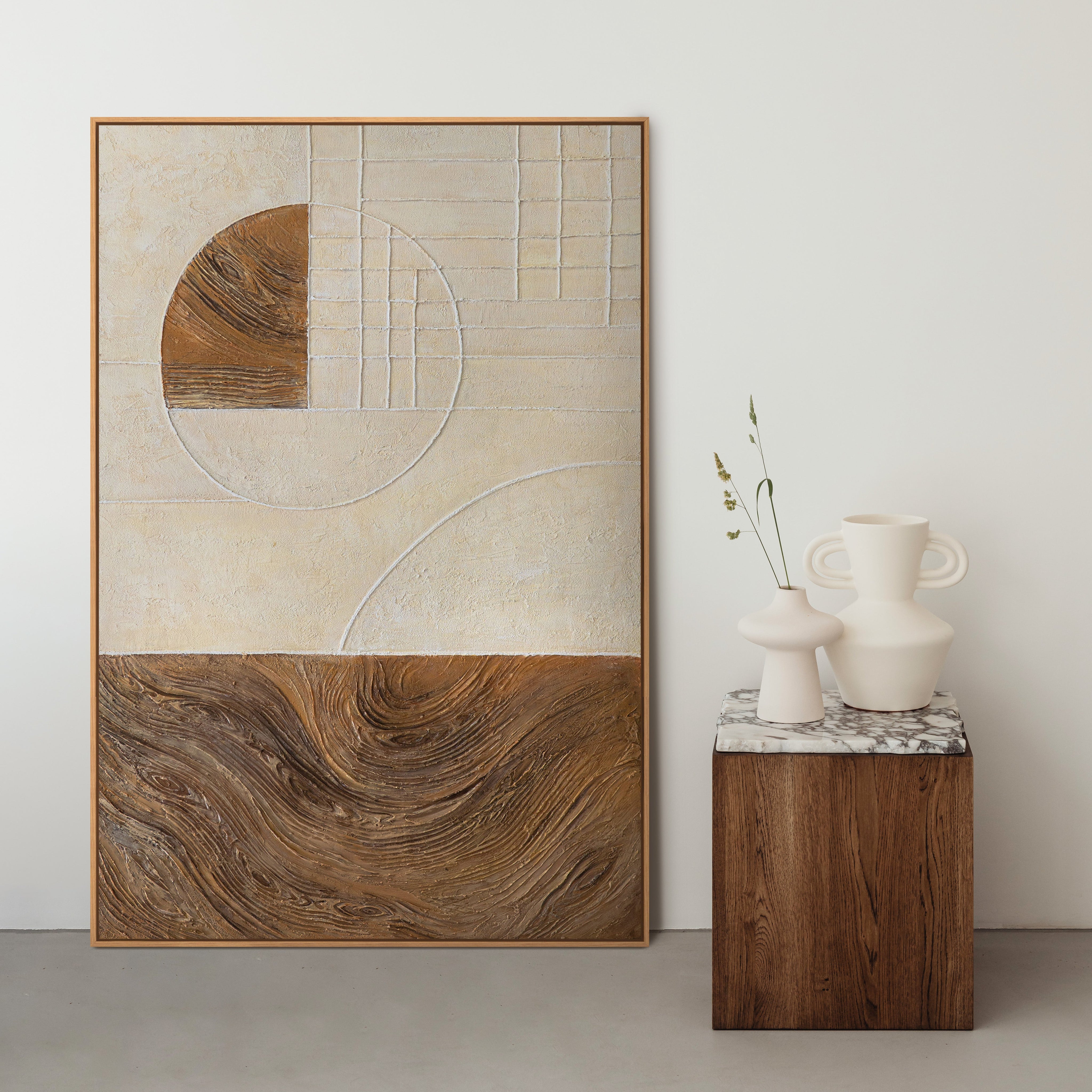 Het werk heeft een evenwichtige, architectonische uitstraling en ontvouwt zich als moderne wanddecoratie in diverse interieurs. Dankzij het neutrale kleurenpalet kan het schilderij op vele manieren gecombineerd worden en blijft het tijdloos en actueel.