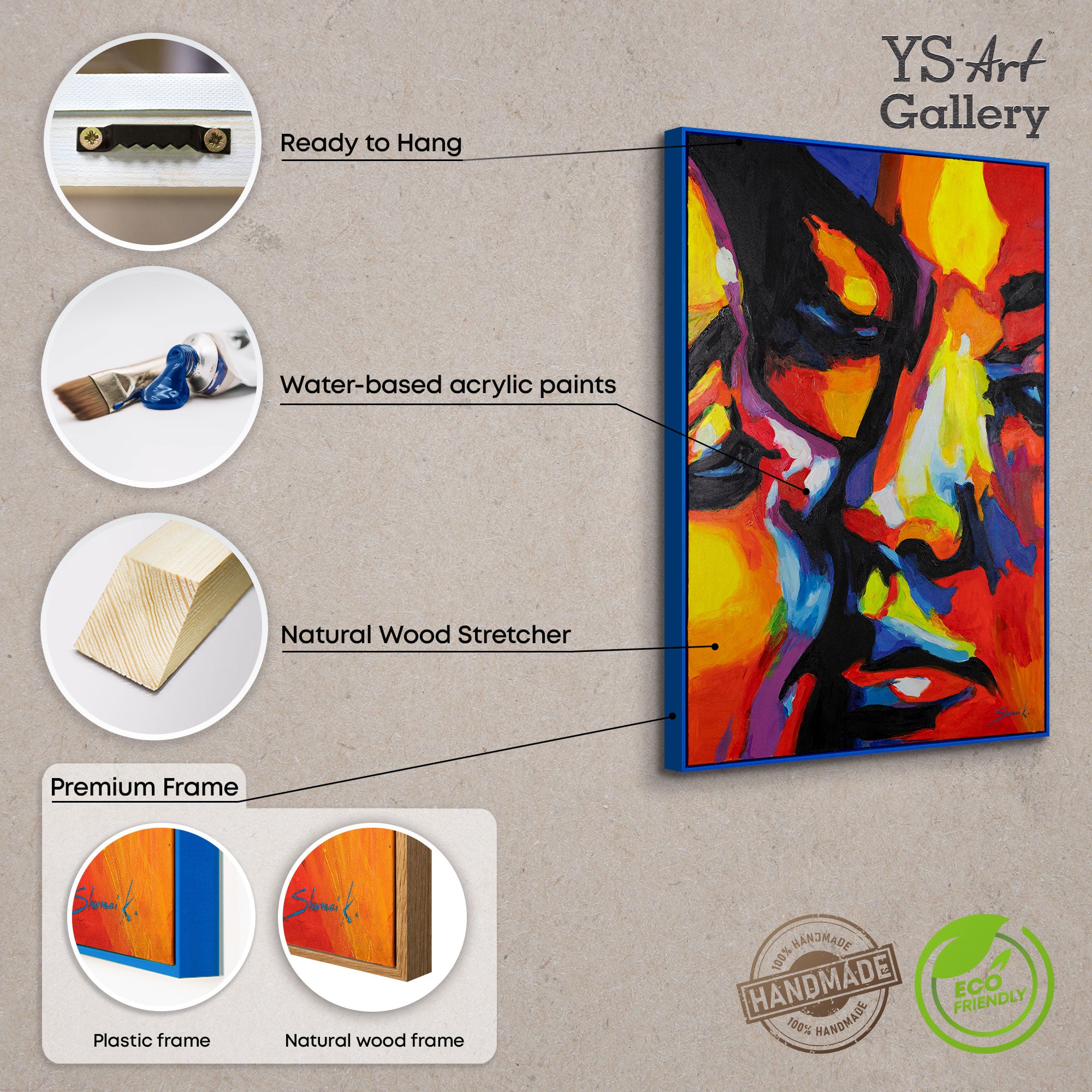 Verrijk uw huis met dit kleurrijke, abstracte kunstwerk dat de emoties en gezichten van twee mensen in levendige kleuren weergeeft. Het schilderij maakt indruk met sterke kleuren en dynamische penseelstreken. Het is 100% handbeschilderd en wordt geaccentueerd door een elegante lijst.