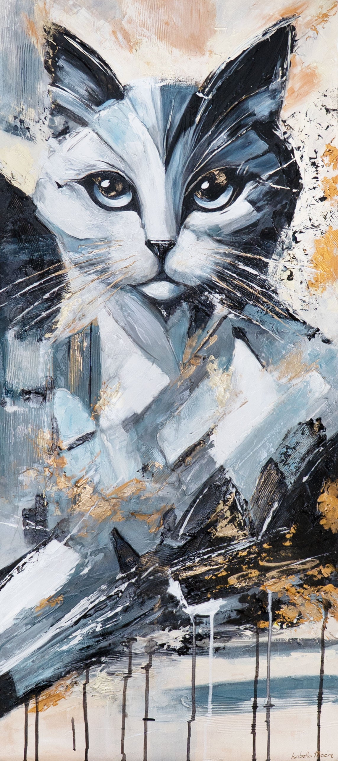 “The Secret of the Cat” is een handgeschilderd acrylschilderij op canvas met een indrukwekkend kattenportret met abstracte penseelstreken en metallic gouden accenten. Het beperkte kleurenpalet van zwart en wit benadrukt de raadselachtige blik van het dier.