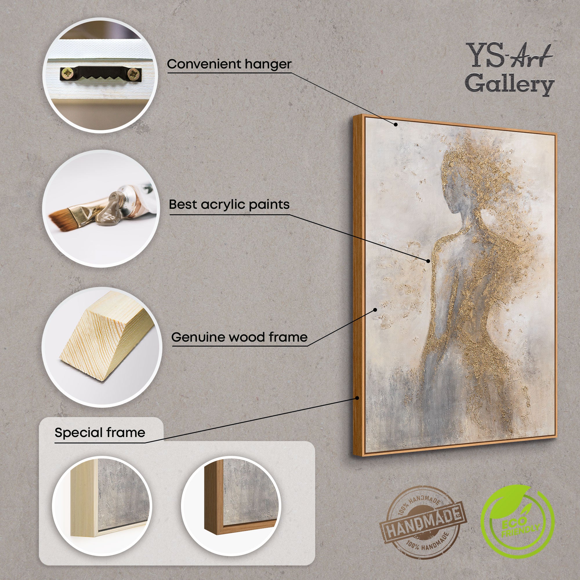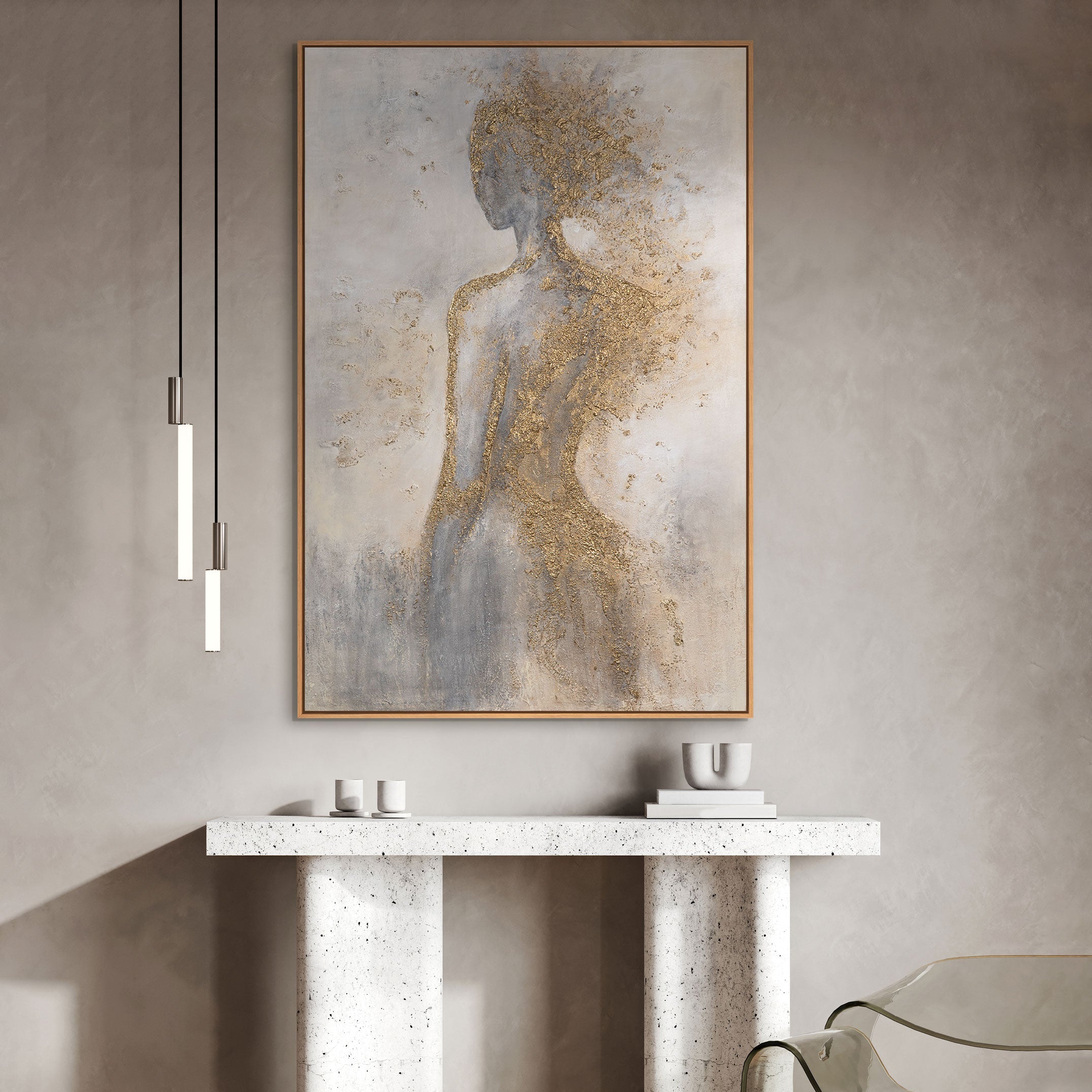 „Goldene Aura“ verkörpert feminine Eleganz in leuchtender Harmonie. Eine zarte Silhouette erhebt sich aus schimmerndem Gold und Nebelgrau – das Spiel von Licht, Struktur und Bewegung schafft eine magische Tiefe. Die handaufgetragene goldene Textur verleiht dem Werk luxuriösen Glanz und außergewöhnliche Haptik.