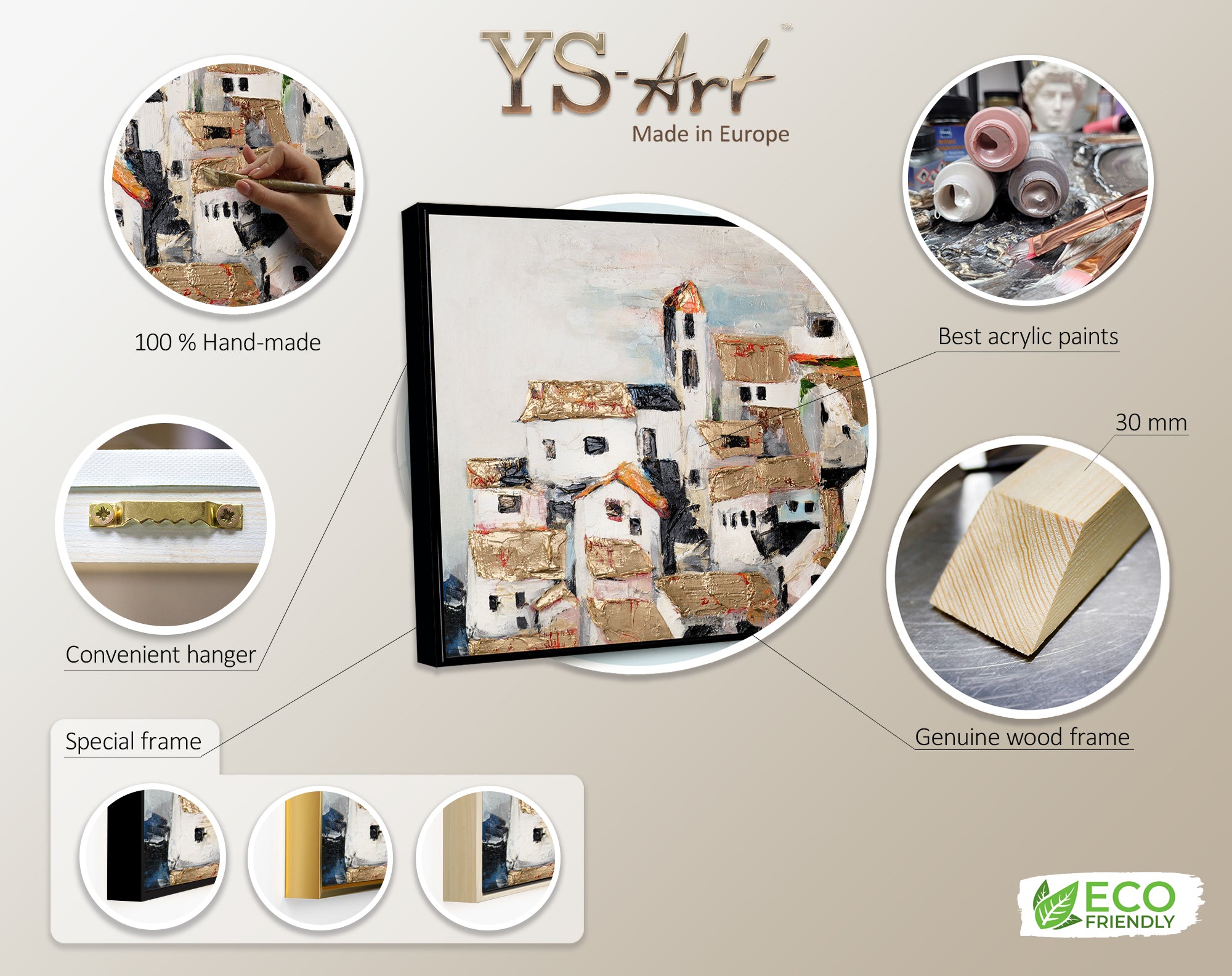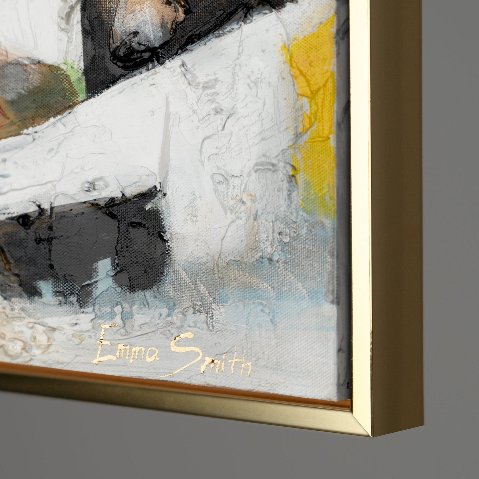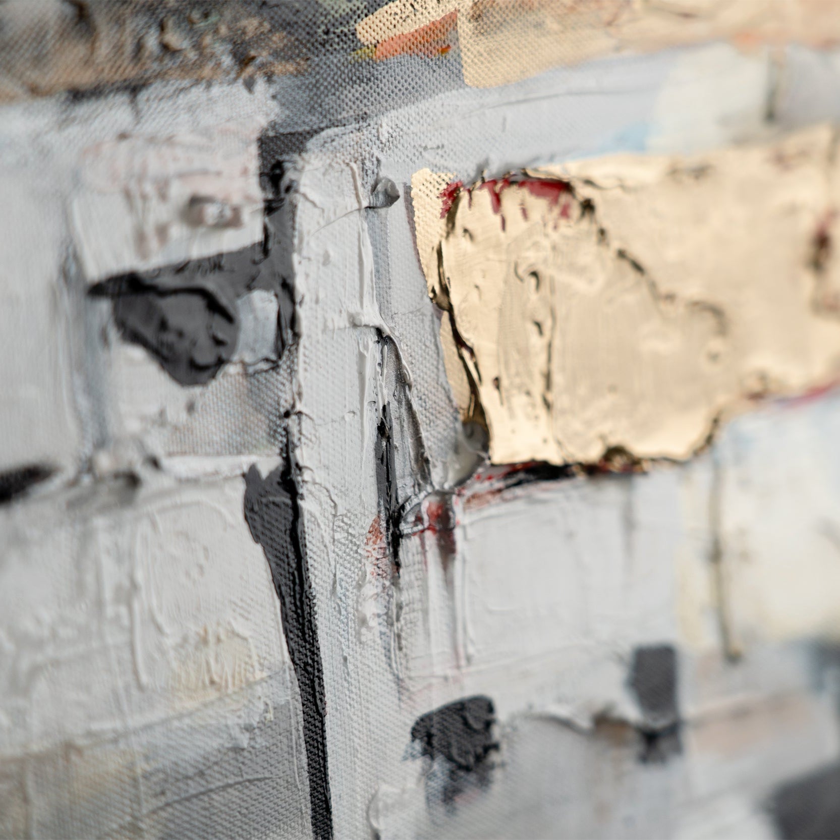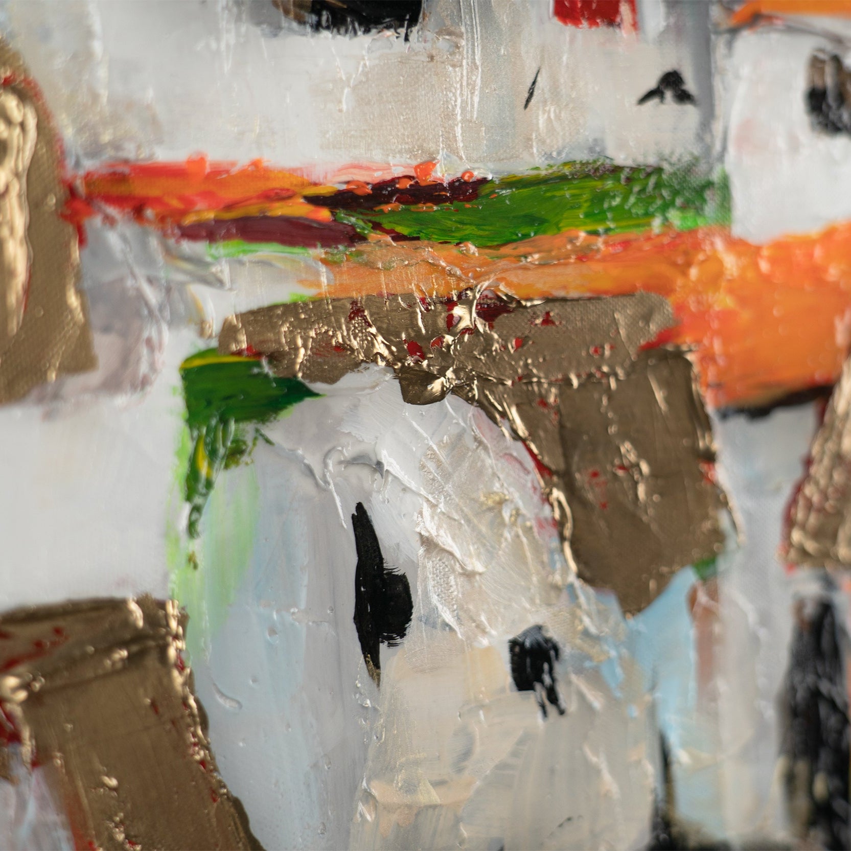 Dieses handgemalte Leinwandbild „Sonnenhäuser“ fängt mit seiner abstrakten Darstellung eine bezaubernde Stadtszene ein. Warme Weiß- und Goldtöne verschmelzen zu einer lebendigen Komposition, die durch ihre reich strukturierte Oberfläche eine besondere Tiefe erhält. Die goldenen Akzente verleihen dem Kunstwerk eine edle Ausstrahlung, die dem Raum Wärme und Eleganz schenkt.