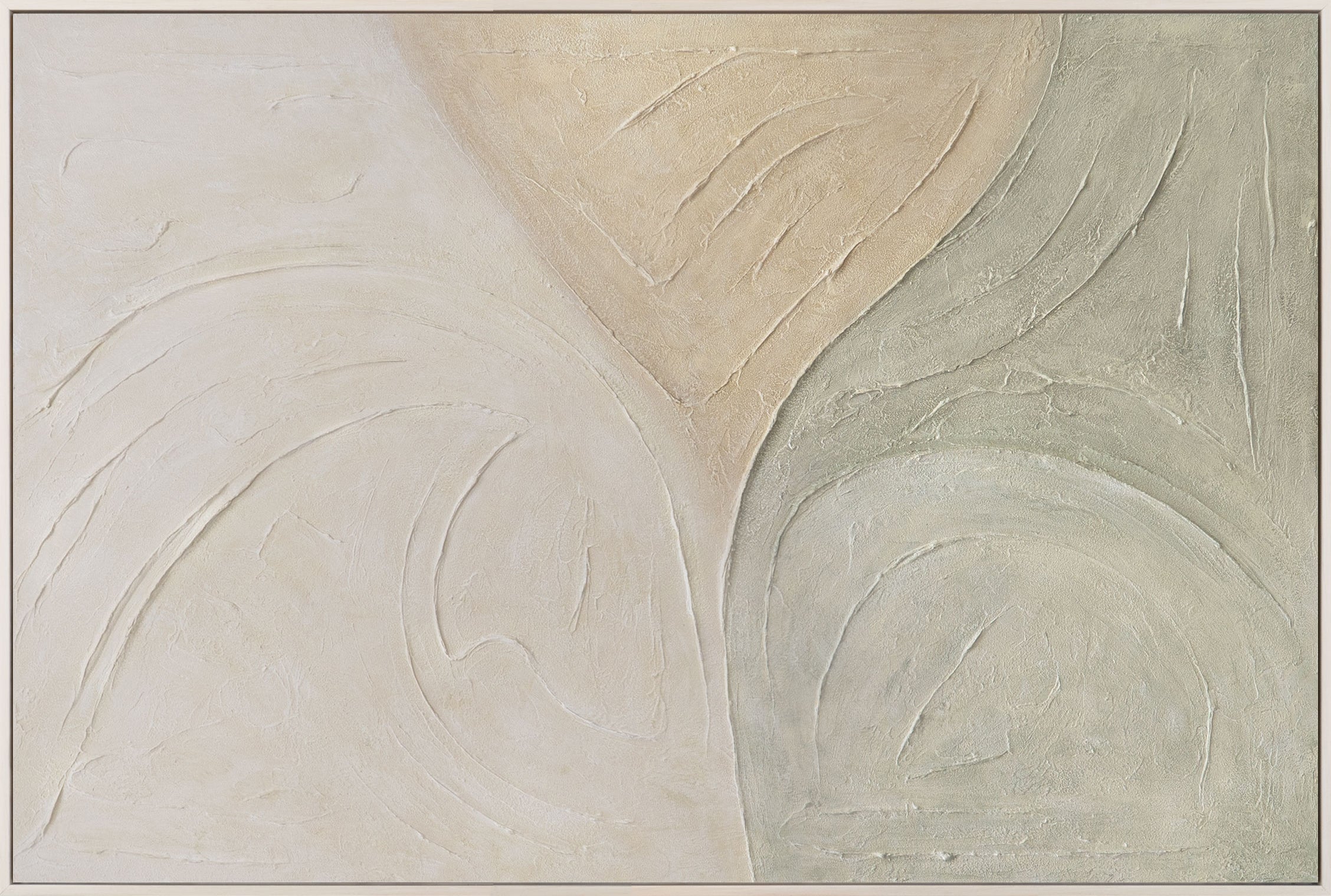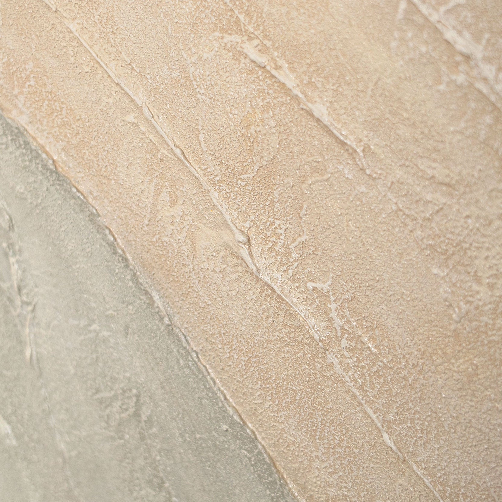 "Sporen van Regen" is een werk dat geen verhaal vertelt, maar eerder een gevoel oproept. Het oppervlak lijkt getekend door water: zachte lijnen, onregelmatige overgangen en een subtiel genuanceerd, licht kleurenpalet van beige, crème en zachte grijstinten.
