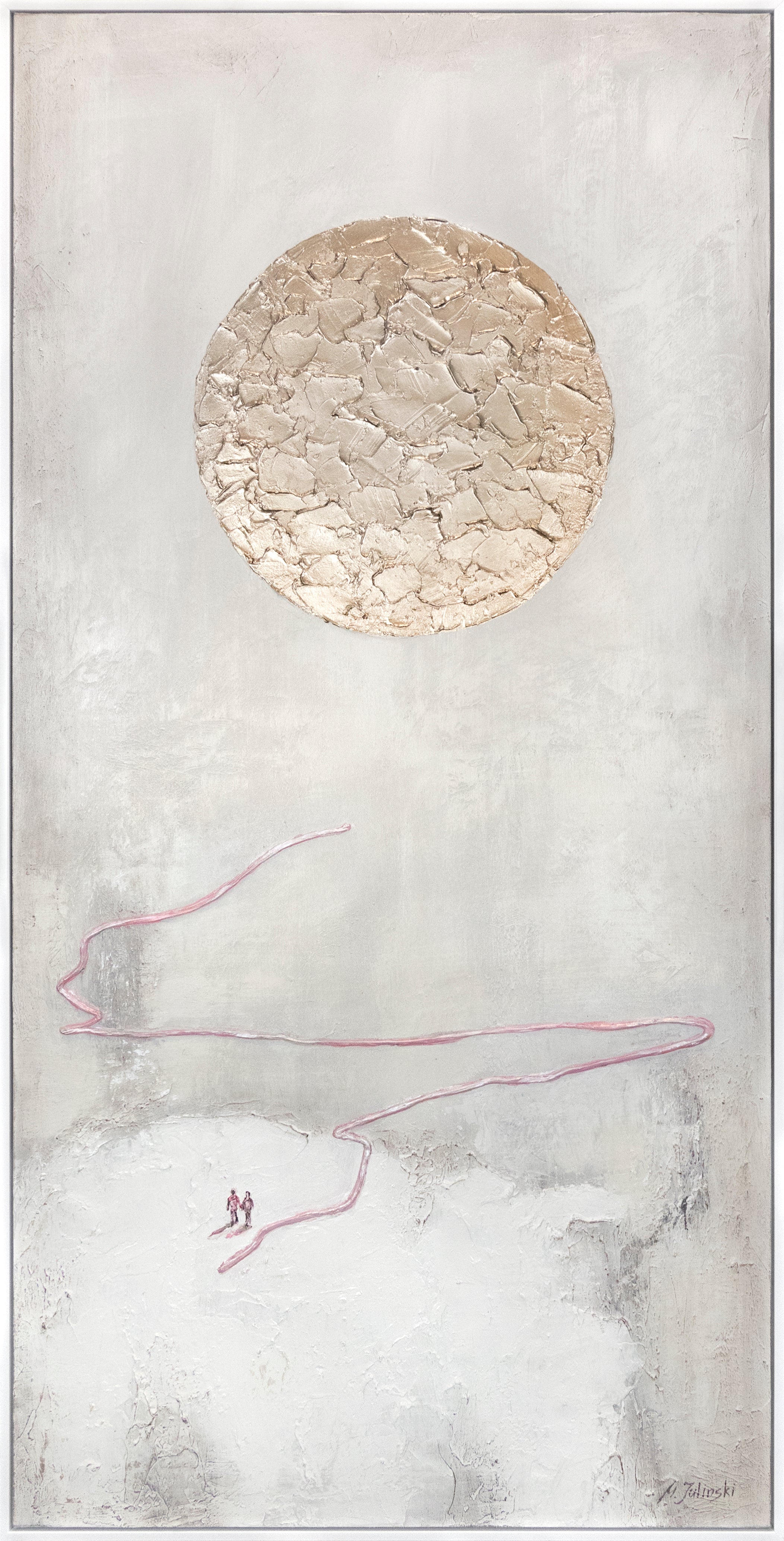“Weg naar de Zon” is een elegant, modern acrylschilderij met gouden accenten op een wit-grijze structuur. De subtiele bergformaties geven het kunstwerk diepte en symboliseren de weg naar verlichting en harmonie. Gouden highlights op het matte oppervlak zorgen voor een luxe contrast en stralen rust uit.