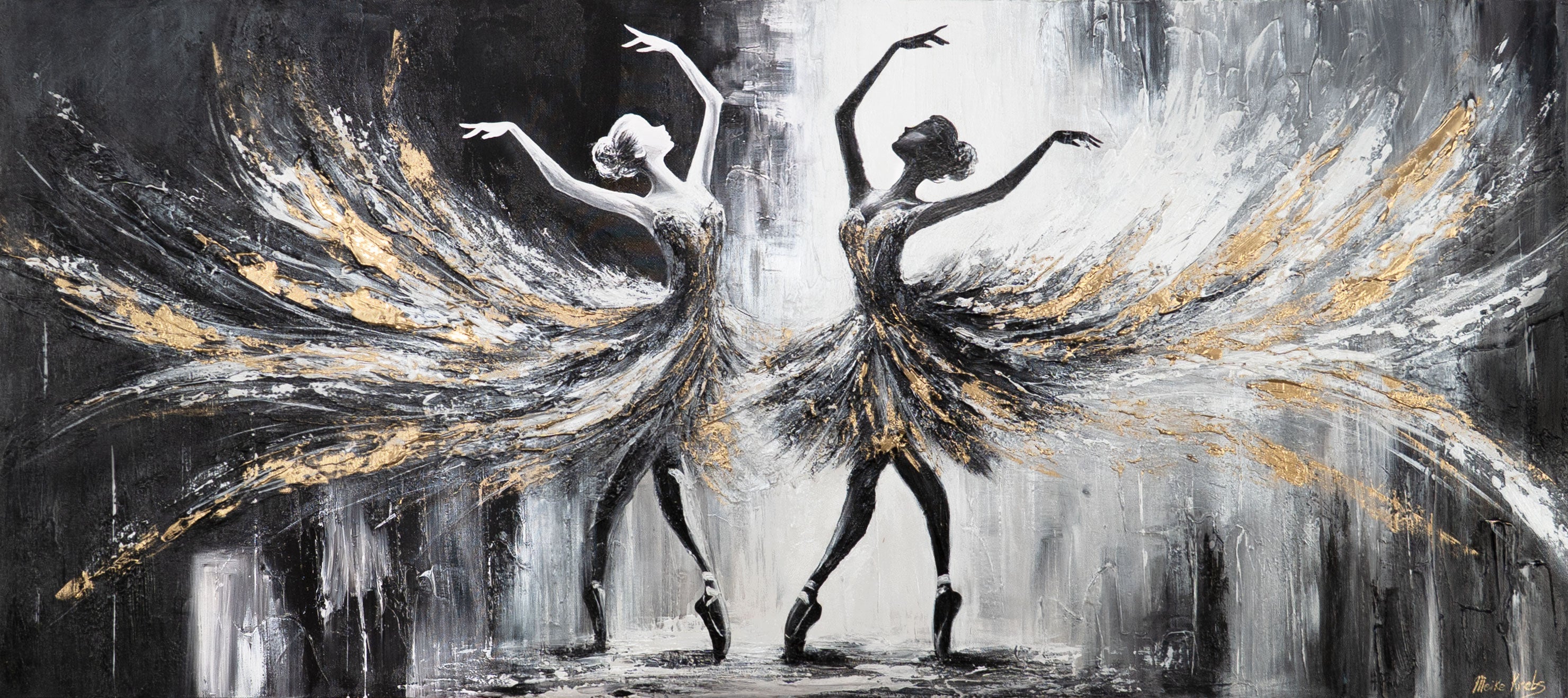 “The Brilliance of Ballet” is een met de hand geschilderd acrylschilderij dat twee dansende diva’s in dynamische bewegingen afbeeldt. Opvallende penseelstreken in zwart, wit, grijs en goud creëren een abstracte compositie die gratie en energie combineert.