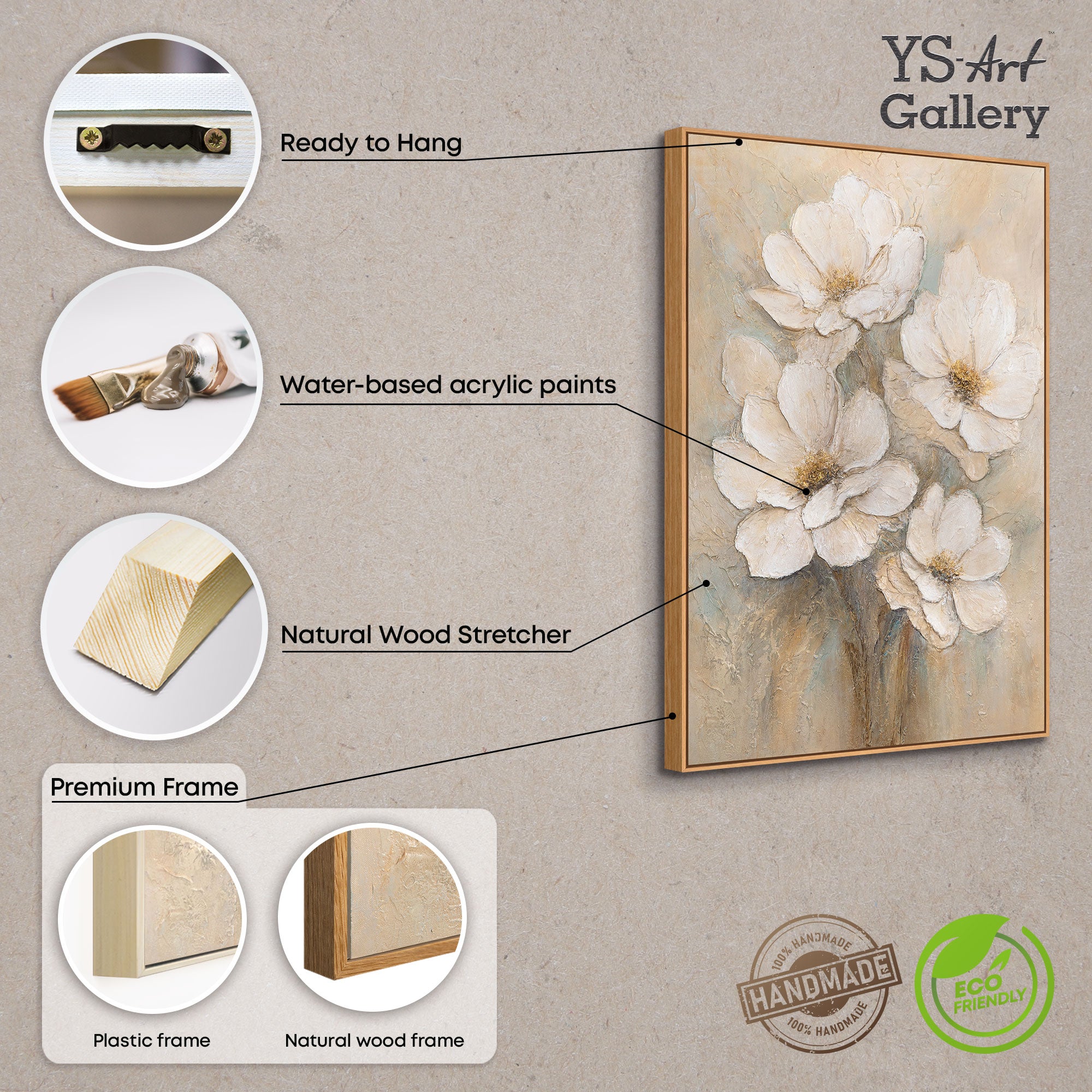 Die organischen Formen verleihen dem Motiv den Charakter hochwertiger Blumenbilder modern. Es ist ein hervorragendes Beispiel für ein Gemälde weiß, das durch dezente Akzente, ähnlich einem Gemälde Beige Gold, veredelt wird. Als Wandbild modern inklusive Rahmen ist es sofort bereit, Ihre Wände zu verschönern. Bei YS-ART erhalten Sie echte Handarbeit, die sich deutlich von industrieller Massenware abhebt.