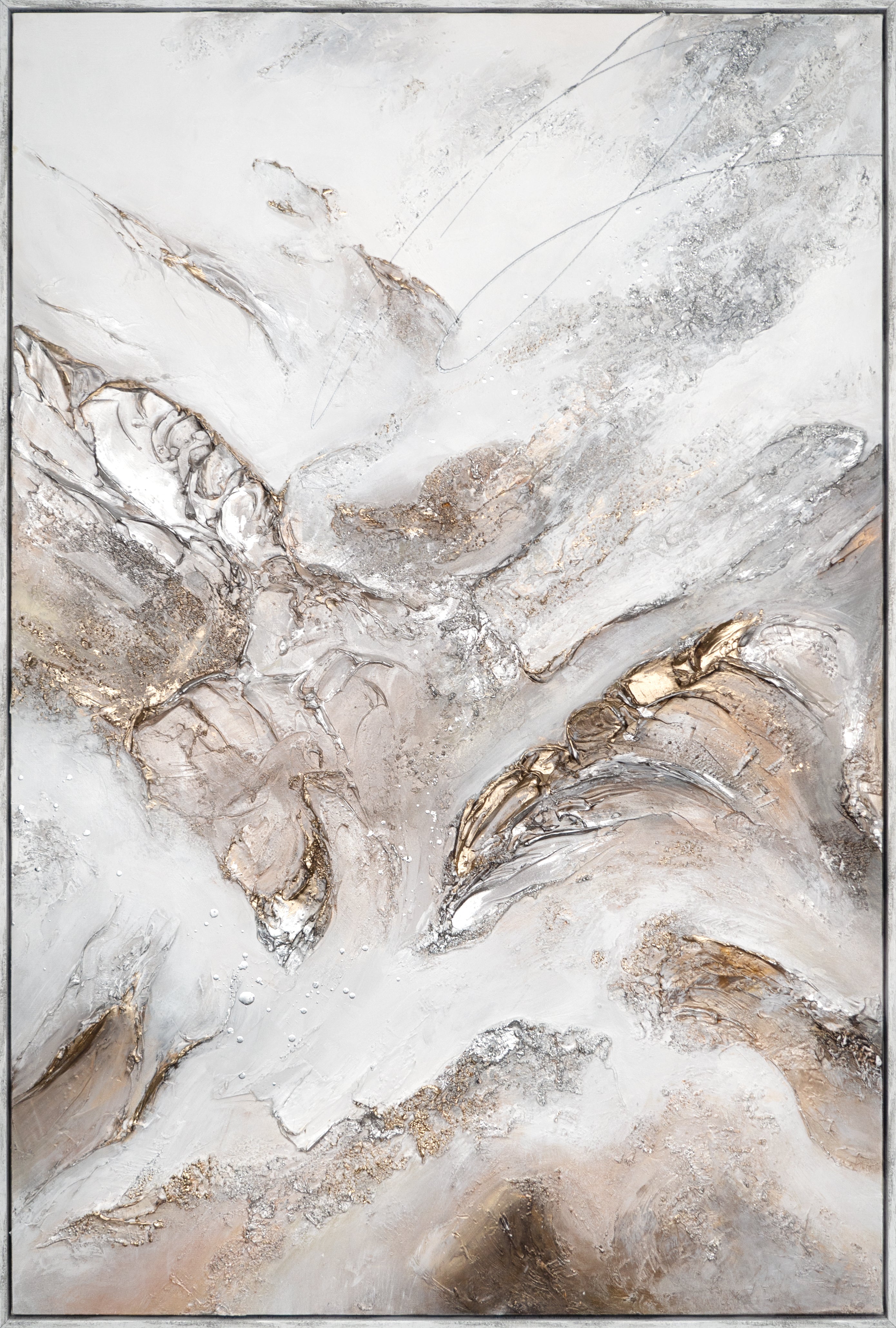Een fascinerend spel van beweging, structuur en kleurnuances ontvouwt zich in het schilderij „Opgang”. Met vloeiende lijnen en schaduwen in beige, wit en goud creëert het schilderij een krachtige dynamiek – bijna als een landschap in transformatie. Het reliëfachtige oppervlak geeft het kunstwerk extra diepte en verankert de abstracte compositie in de driedimensionaliteit.