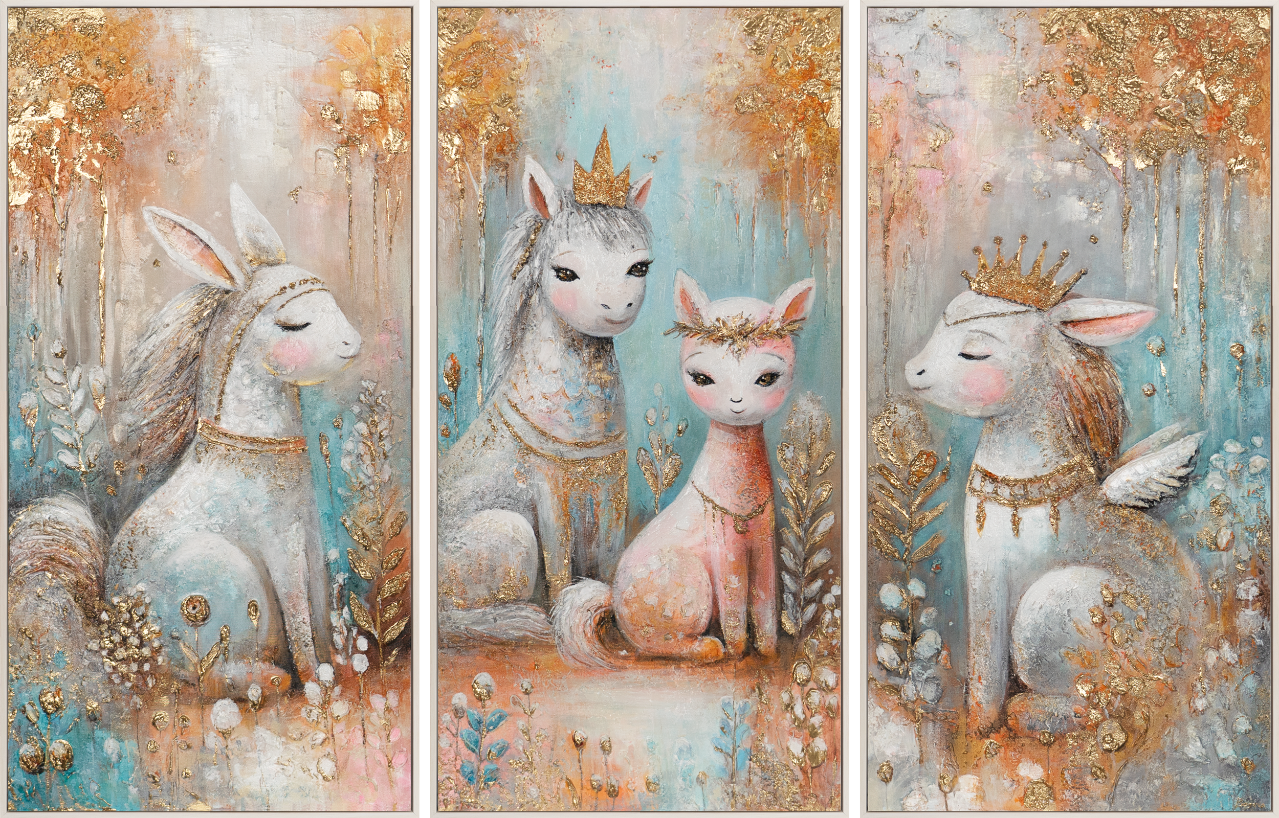 Het driedelige triptychon “Sprookjesachtige Wezens” toont een betoverende compositie van fantasierijke, sprookjesachtige figuren op drie handgeschilderde canvaspanelen. Zachte pasteltinten, gouden accenten en zorgvuldig uitgewerkte details creëren een magische en warme sfeer, waardoor kinderkamers worden omgetoverd tot een droomwereld. De handgeschilderde textuur en het royale formaat van de drie panelen geven een indrukwekkende wanddecoratie die warmte en geborgenheid uitstraalt.