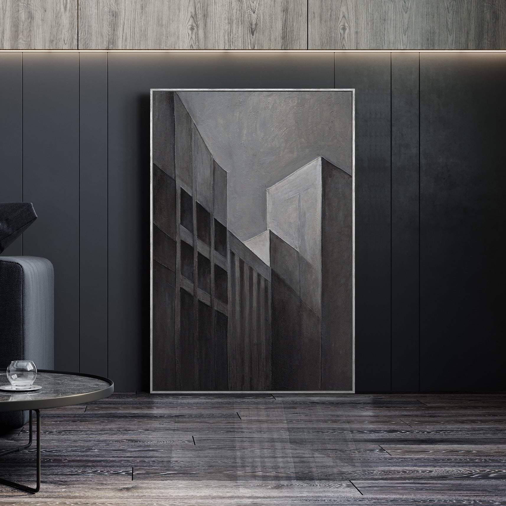 Das handgemalte Acrylbild auf Leinwand überzeugt durch seine ruhige, minimalistische Ausstrahlung und ist perfekt für moderne, industrielle oder minimalistische Räume geeignet. 100 % handgemalt in Deutschland, mit hochwertiger Strukturtechnik gefertigt, sicher verpackt und versandkostenfrei geliefert – Architektur und Kunst in perfekter Harmonie.