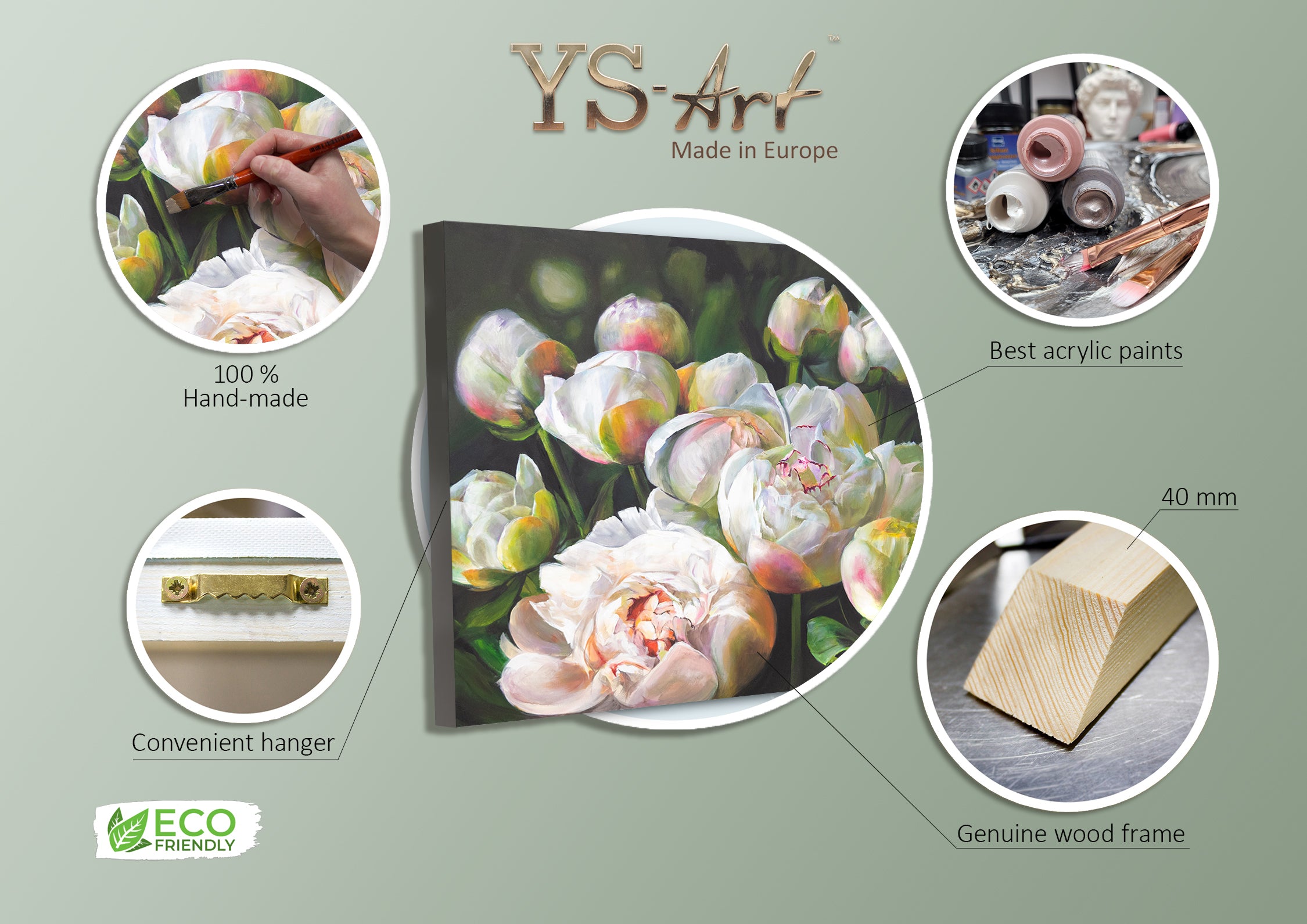 Pioenrozen stralen een krachtige en schone energie uit die je geluk brengt in je persoonlijke en professionele leven. Hoe verzadigder de kleur van de bloemblaadjes, hoe sterker de energetische eigenschappen. Daarom zal ons schilderij "Welvaart" niet alleen het interieur van uw huis verfraaien, maar ook de sfeer daarin in alle opzichten positief maken.