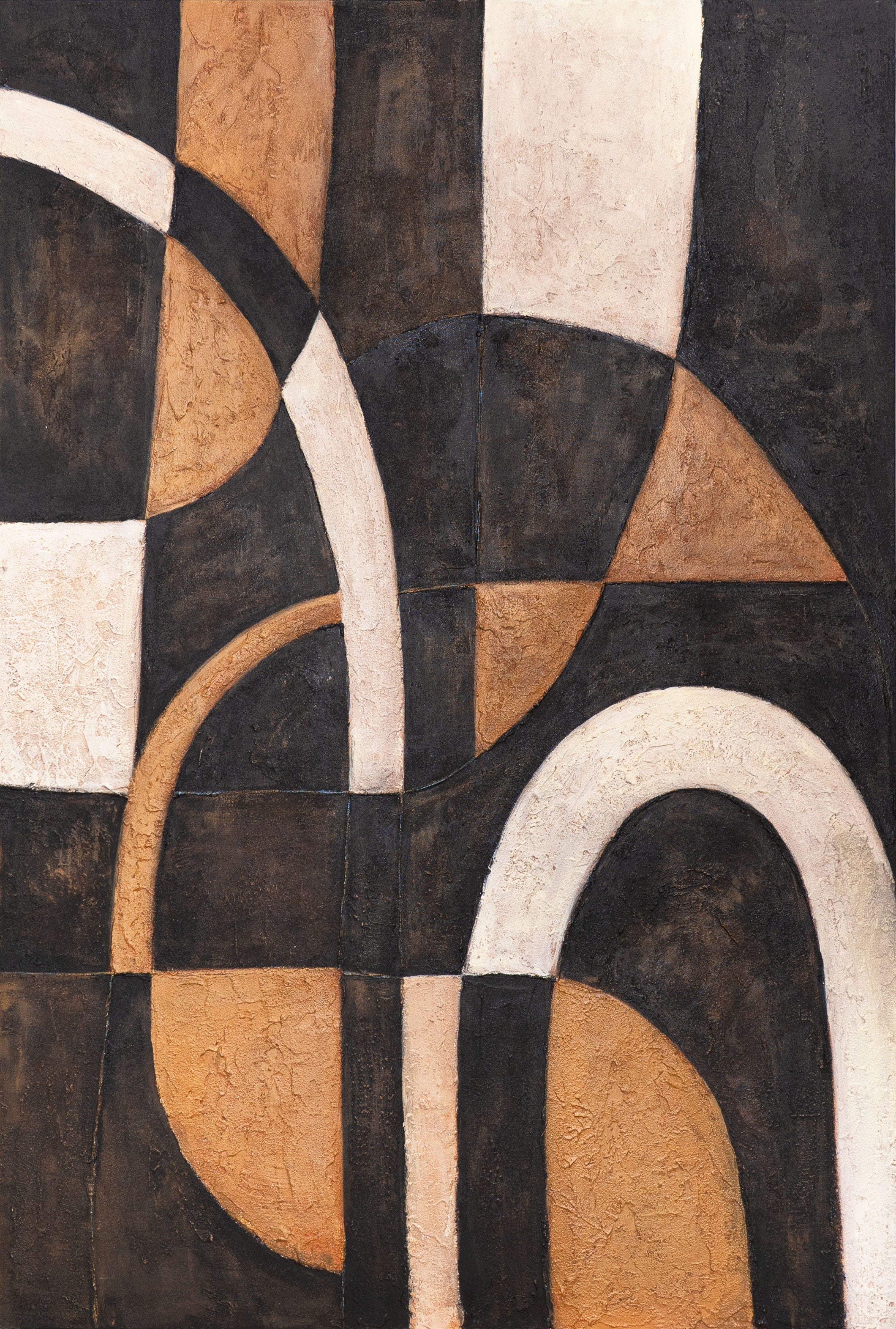 Dit handgeschilderde kunstwerk fascineert met een spel van gebogen lijnen en geometrische vlakken. De combinatie van warm bruin, edel beige en diep zwart creëert een harmonieuze interactie van contrasten. Het gestructureerde oppervlak geeft het schilderij diepte en karakter, waardoor het een echte blikvanger wordt.
