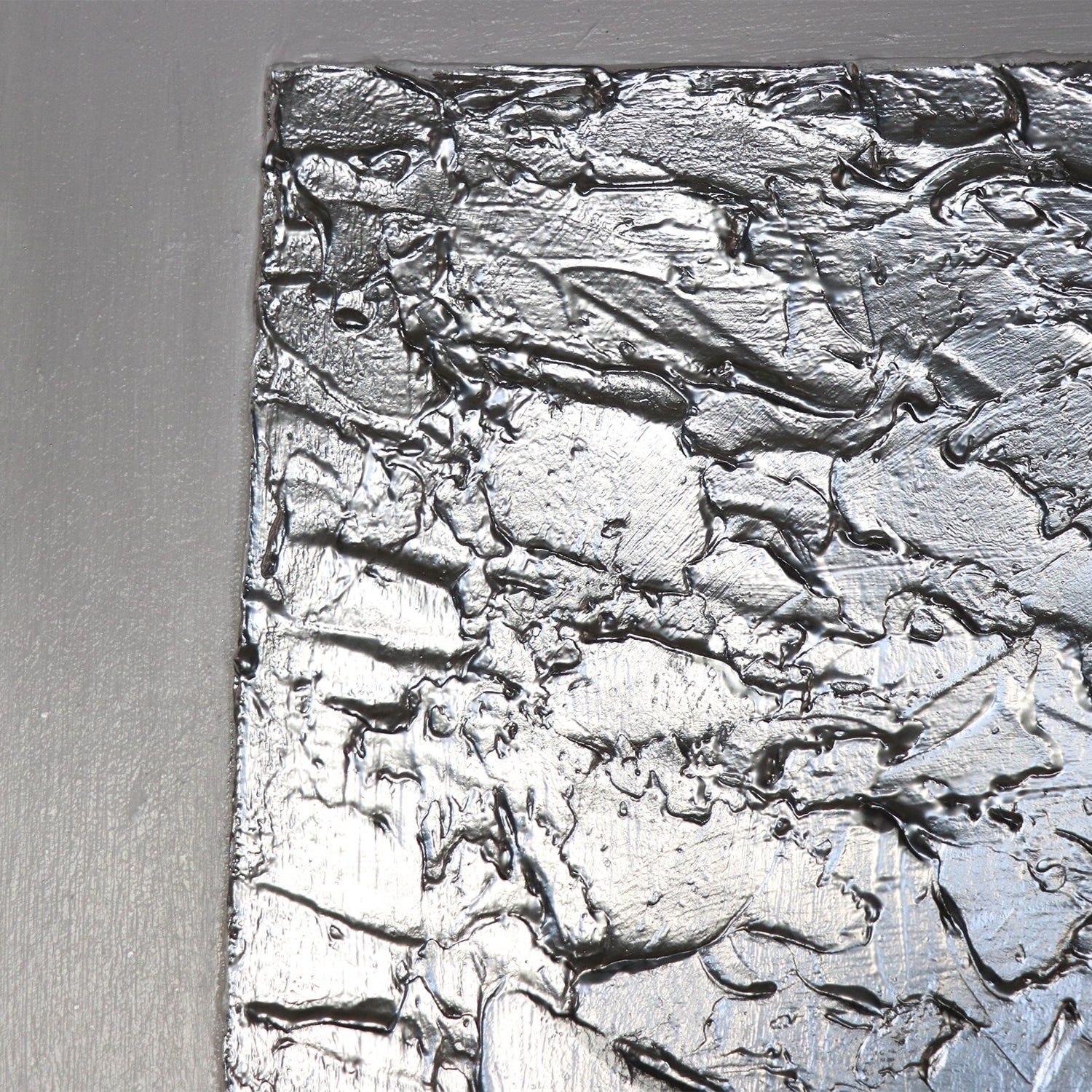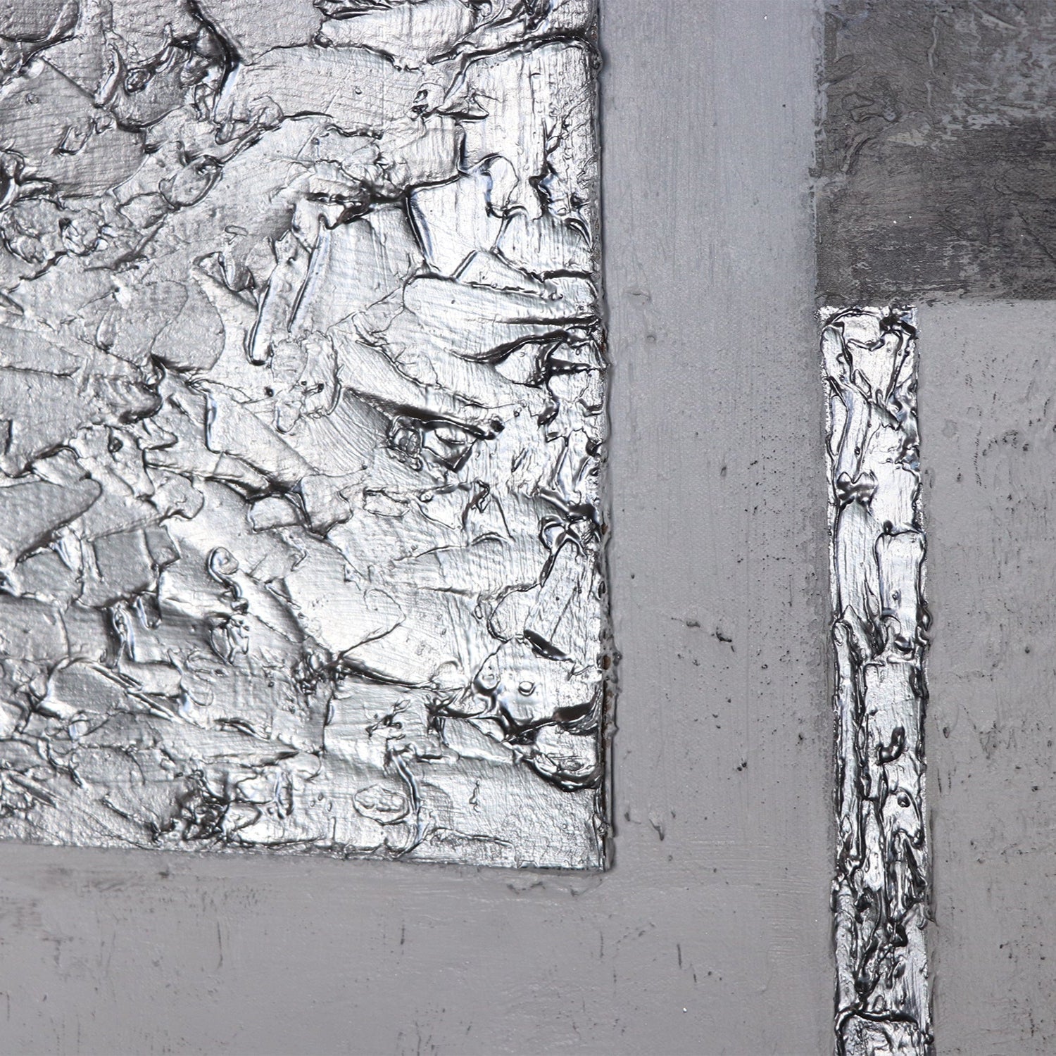 “Perfecte Stabiliteit” is een modern acrylschilderij met een gestructureerd oppervlak dat indruk maakt door zijn strakke compositie en ingetogen kleurgebruik. In het midden bevindt zich een zilveren rechthoek met sterke textuur die krachtig contrasteert met de gladde grijze en witte vlakken. De subtiele, metalen accenten zorgen voor diepte en elegantie, terwijl de harmonische verdeling het kunstwerk stabiliteit en balans geeft.