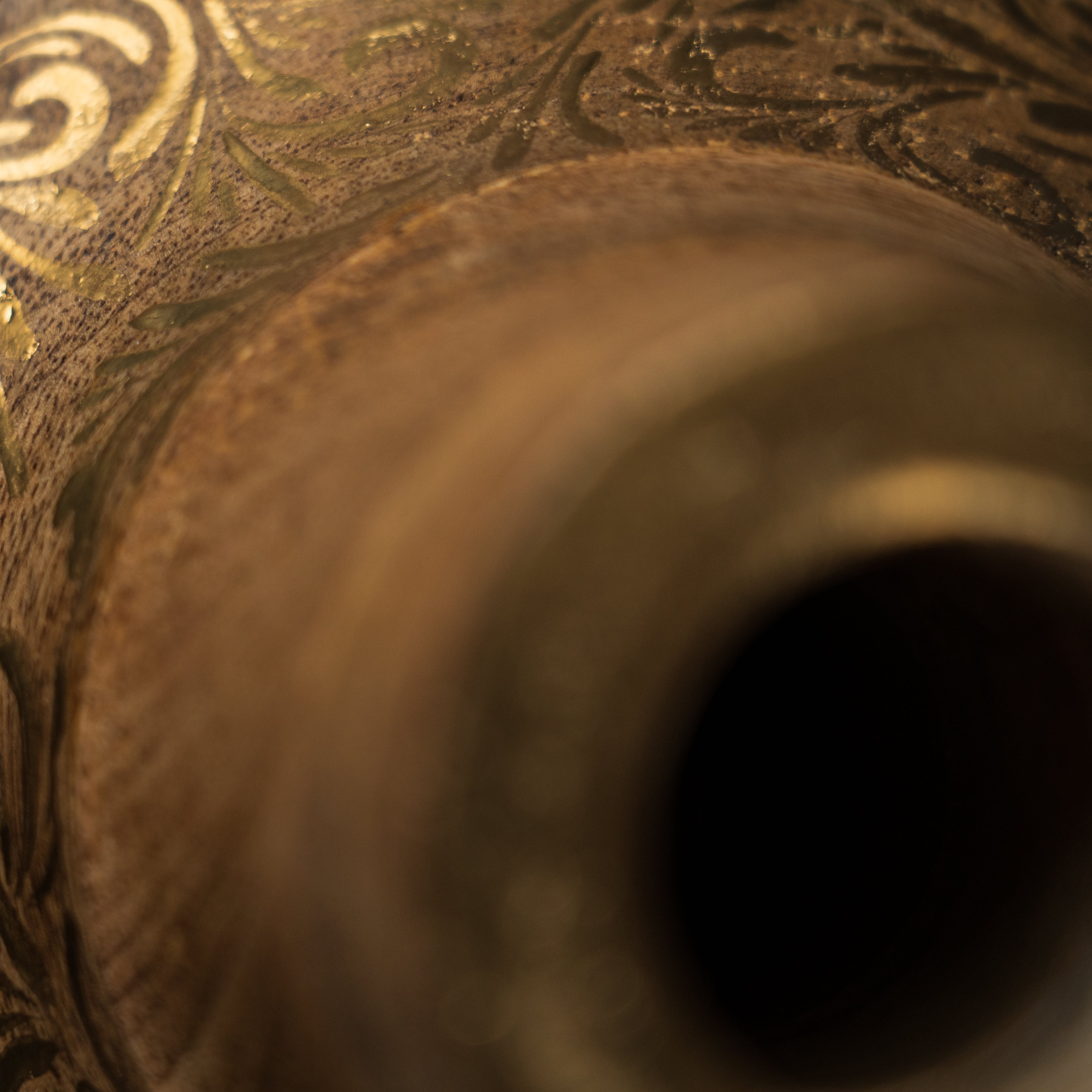 Deze handgemaakte houten vaas combineert de natuurlijke warmte van massief hout met elegante, goudkleurige ornamenten. Elk exemplaar is uniek en wordt zorgvuldig met de hand gedraaid en gedecoreerd, waardoor de vaas een artistieke blikvanger in uw interieur wordt.