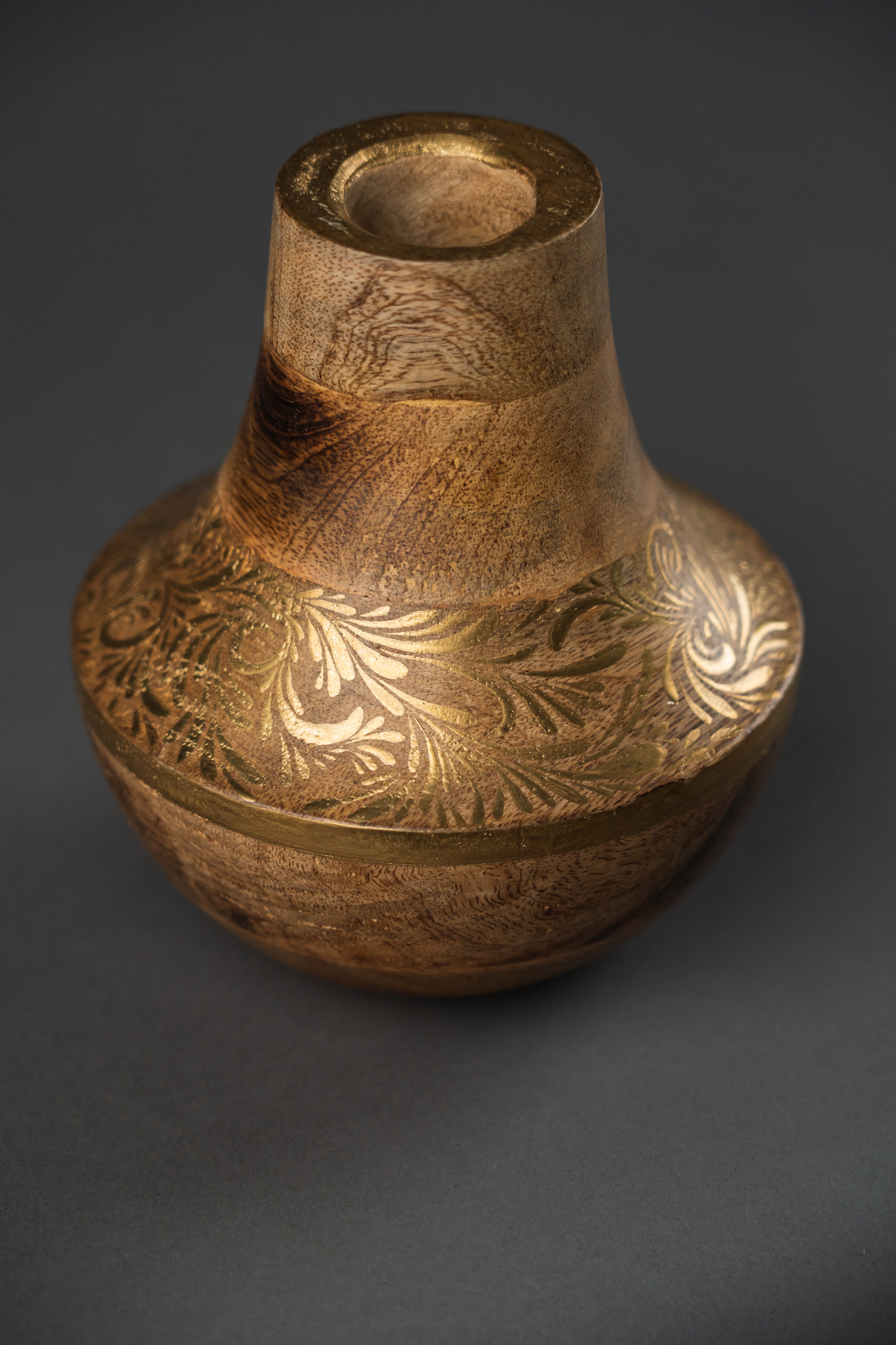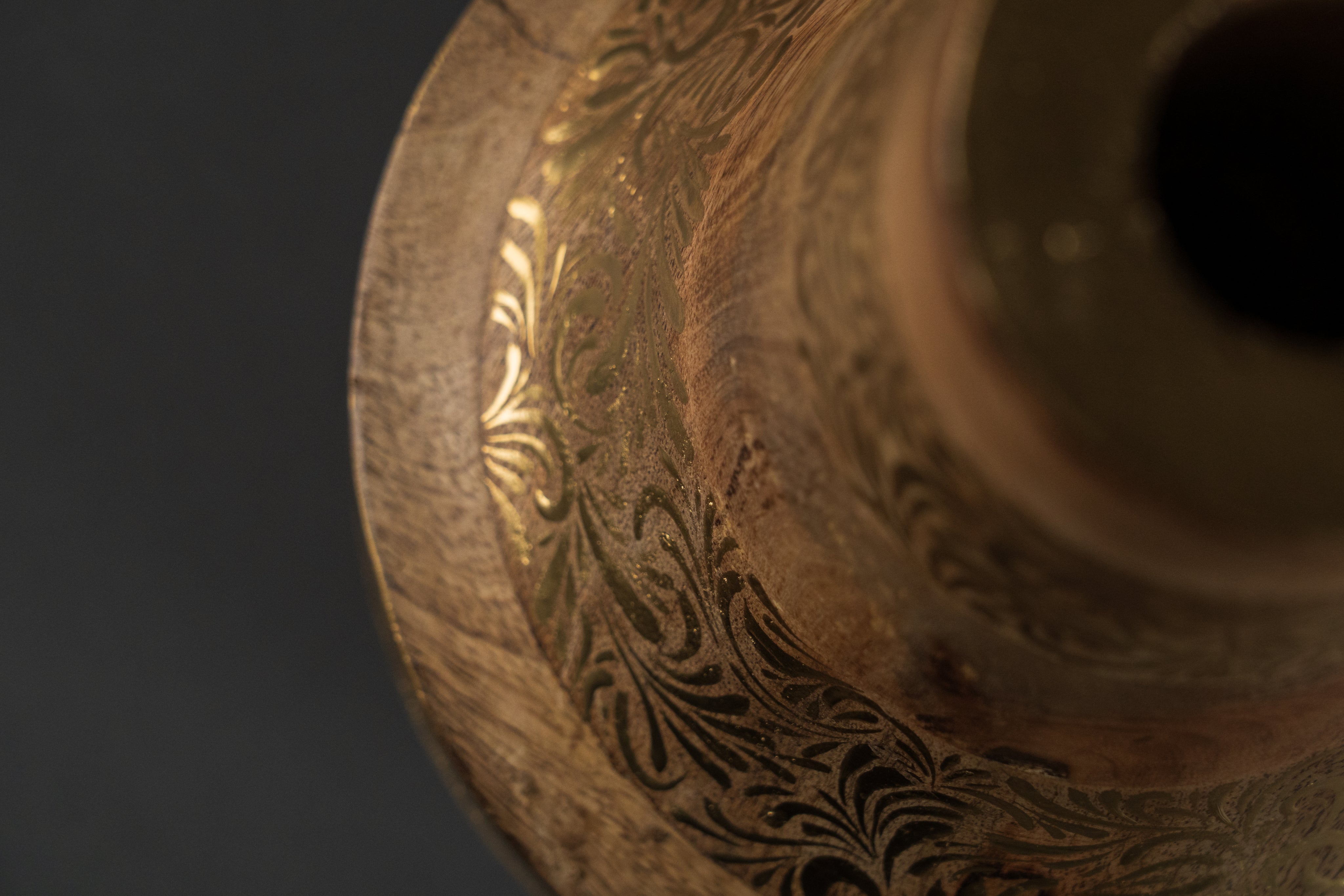 Unieke vaas van massief hout, met goudbeschildering en fijn handwerk. Voegt stijl en warmte toe aan uw huis – ideaal als exclusief cadeau.