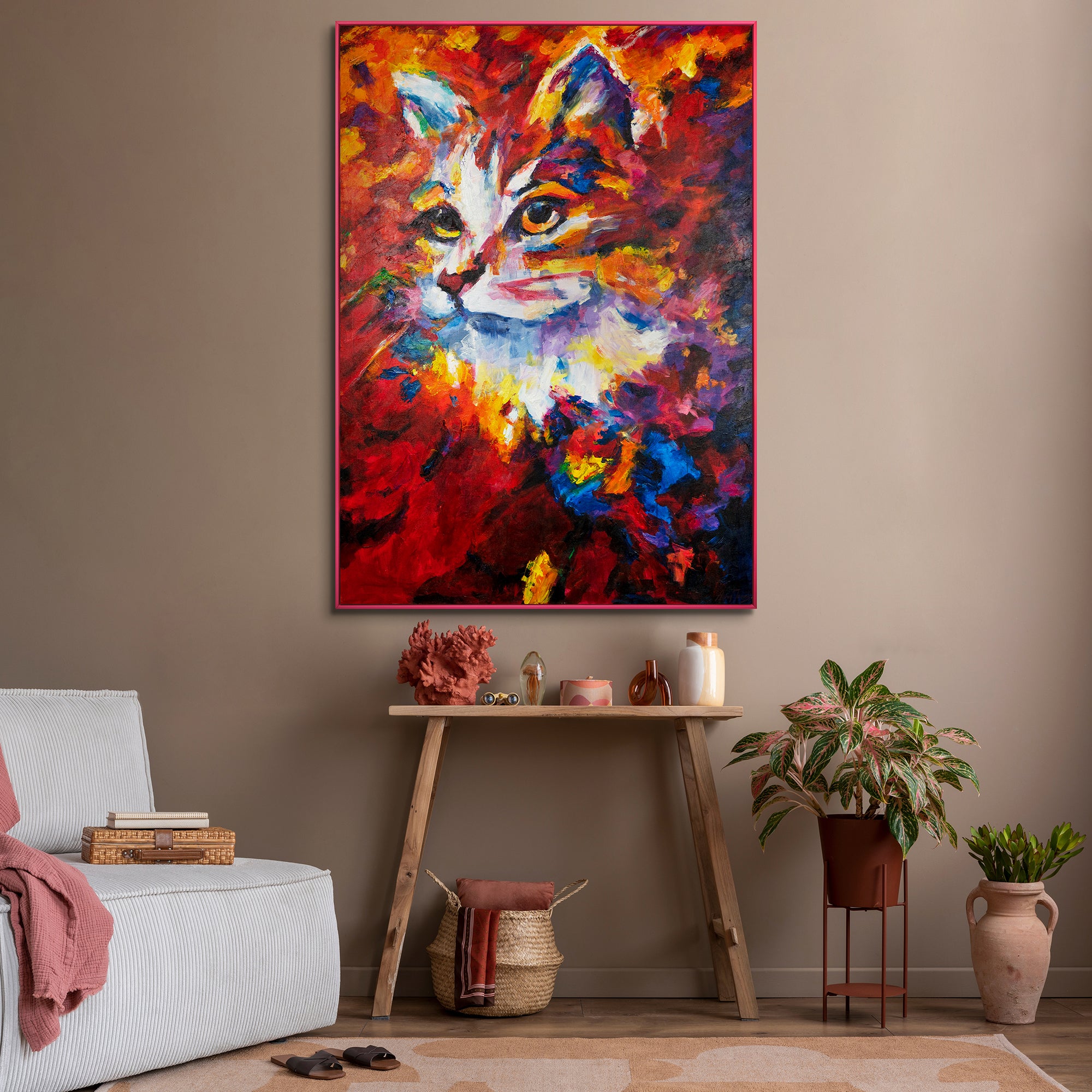 Dompel uzelf onder in de wereld van moderne kattenkunst met ons exclusieve acrylschilderij van de kat. Elk schilderij uit deze serie is een handgeschilderd meesterwerk, gemaakt met hoogwaardige acrylverf op canvas. De levendige kleuren en indrukwekkende textuur geven het kunstwerk een levensechte dimensie die elke kijker boeit. Het stevige frame rondom de afbeelding versterkt de schoonheid van het kunstwerk en zorgt ervoor dat u het direct thuis of op kantoor kunt ophangen.