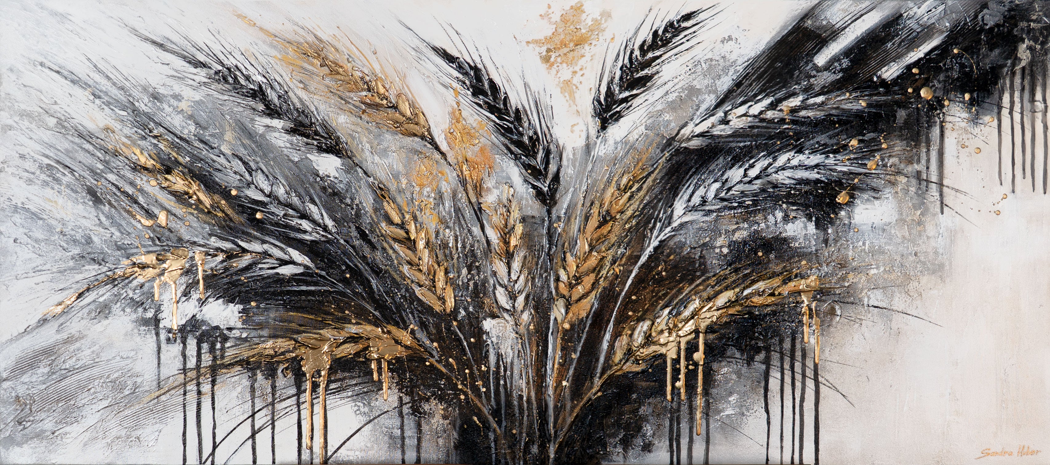 Het kunstwerk “Stacheln” toont een moderne, met de hand geschilderde compositie van goudgele maïskolven, die direct fascineert door zijn diepte en dynamiek. De combinatie van zwart, wit en glanzend gouden tinten creëert een elegant spel van structuur, beweging en contrast.