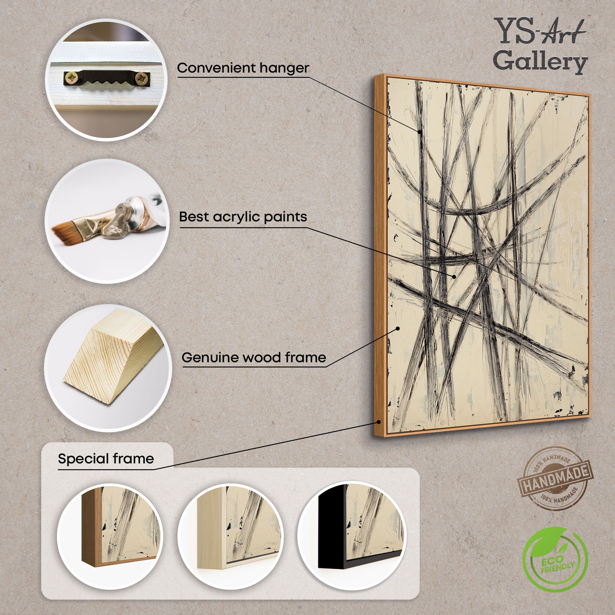 „Parallelen und Schnittpunkte“ vereint Bewegung und Struktur in einem einzigen Ausdruck. Schwarze Linien durchkreuzen die sanfte beigefarbene Fläche, schaffen Rhythmus, Energie und visuelle Tiefe. Das Zusammenspiel von Kontrast und Textur vermittelt Spannung und Balance zugleich – ein Bild, das den Raum belebt und gleichzeitig ordnet.