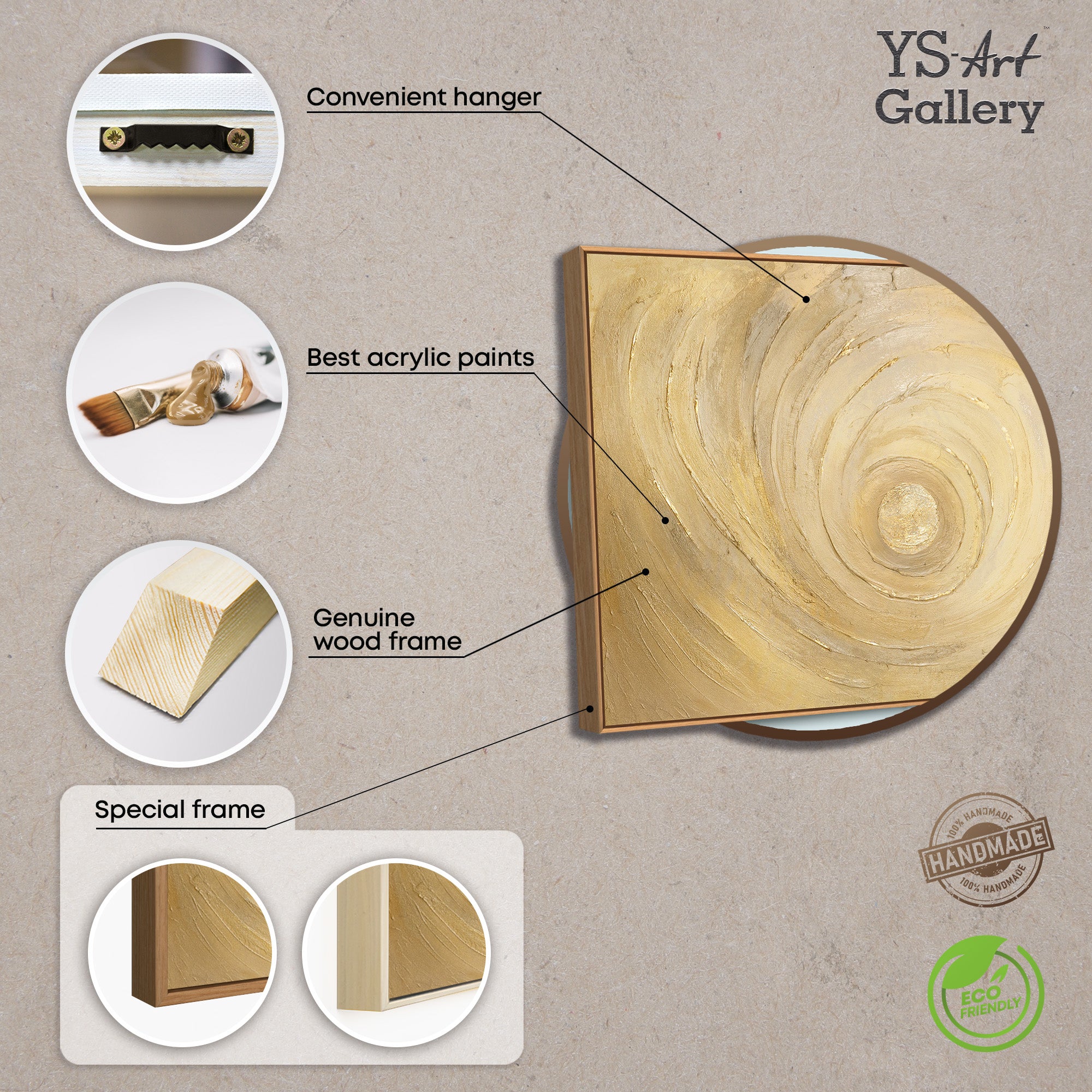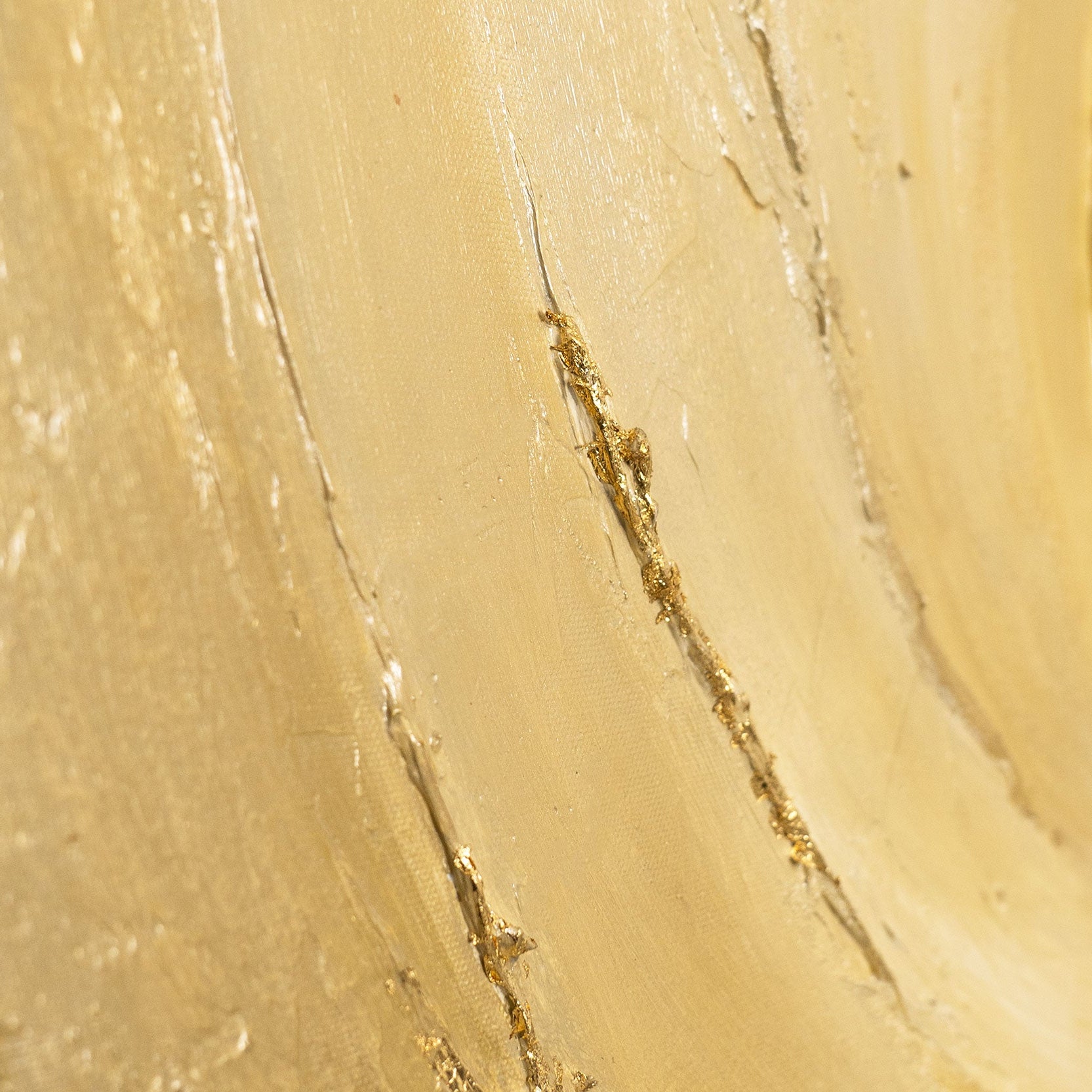 Dit abstracte gouden schilderij trekt direct de aandacht met zijn cirkelvormige compositie en warme goudtinten die zich zacht vanuit het centrum verspreiden. De gelaagde structuur zorgt voor een gevoel van diepte en beweging, terwijl de harmonieuze kleurovergangen een rustige, elegante sfeer in de ruimte brengen.