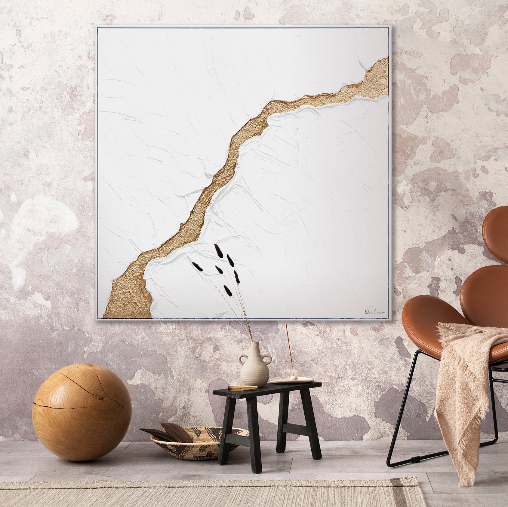 Ervaar de elegantie van abstracte kunst met "Die Flut" – een handgeschilderd groot schilderij met verfijnde bladgoud-accenten. De subtiele textuur en het stijlvolle ontwerp maken dit kunstwerk tot een perfecte blikvanger voor moderne schilderijen in eigentijdse interieurs. De hoogwaardige witte lijst geeft het kunstwerk een tijdloze uitstraling.