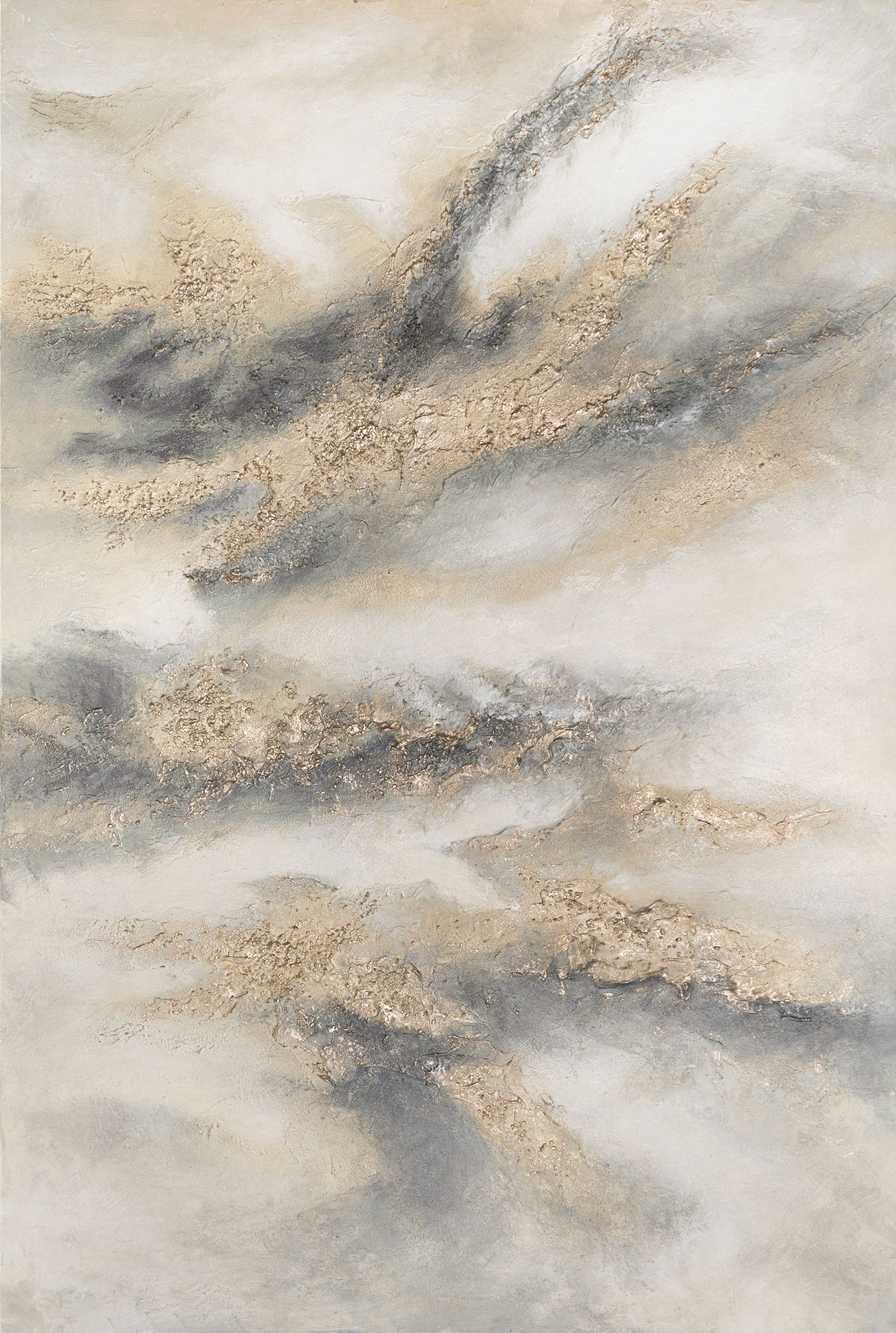 Breng rust en elegantie in uw huis met dit handgeschilderde structuur schilderij. Zachte wolkenvormen in grijs, beige en wit smelten harmonieus samen met gouden accenten en geven het schilderij een edele, bijna zwevende lichtheid. Elke penseelstreek en elke reliëfstructuur maakt dit werk tot een uniek kunstobject.