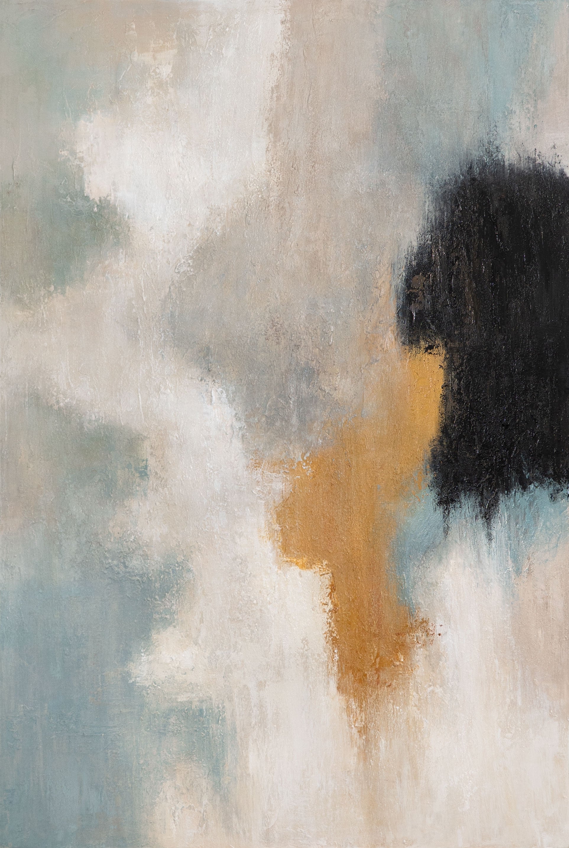 "Lichtovergangen" is een modern, handgeschilderd acryl schilderij dat fascineert door de harmonieuze verbinding van lichte beige, zachte blauwtinten en krachtige zwarttinten. Warme goudaccenten geven het schilderij een bijzondere uitstraling, terwijl het reliëfachtige oppervlak de diepte en beweging benadrukt.