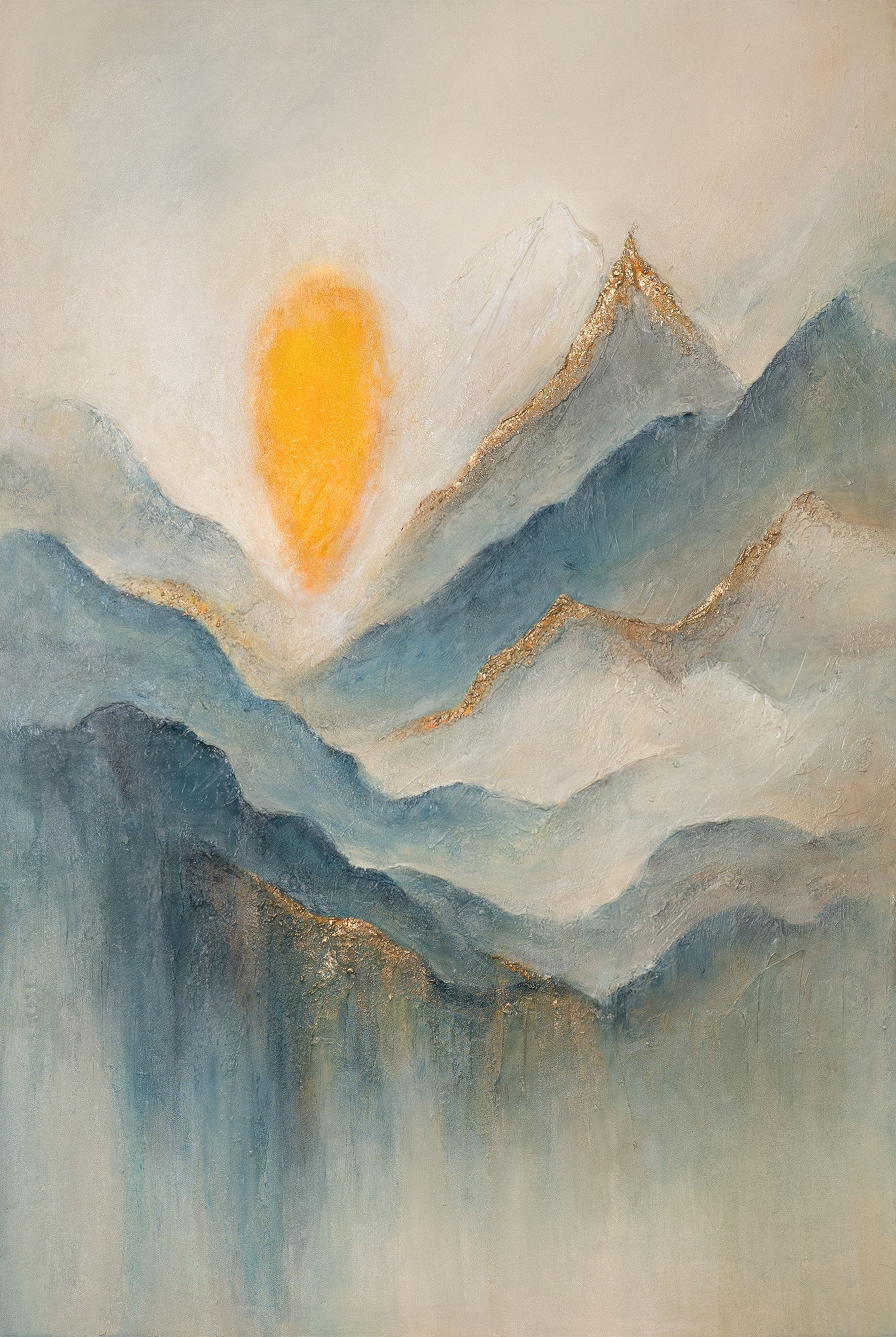 „Ochtendgloren in de Wolken“ is een fascinerend, handgeschilderd acrylschilderij, dat met zijn combinatie van stralend goud en zachte blauwtinten weet te betoveren. De dynamische penseelstreken geven de bergen en wolken een bijzondere diepte, terwijl de gouden accenten de zonsopgang indrukwekkend benadrukken. Het gestructureerde oppervlak onderstreept de levendigheid van het motief en maakt het werk een blikvanger met een expressieve uitstraling.