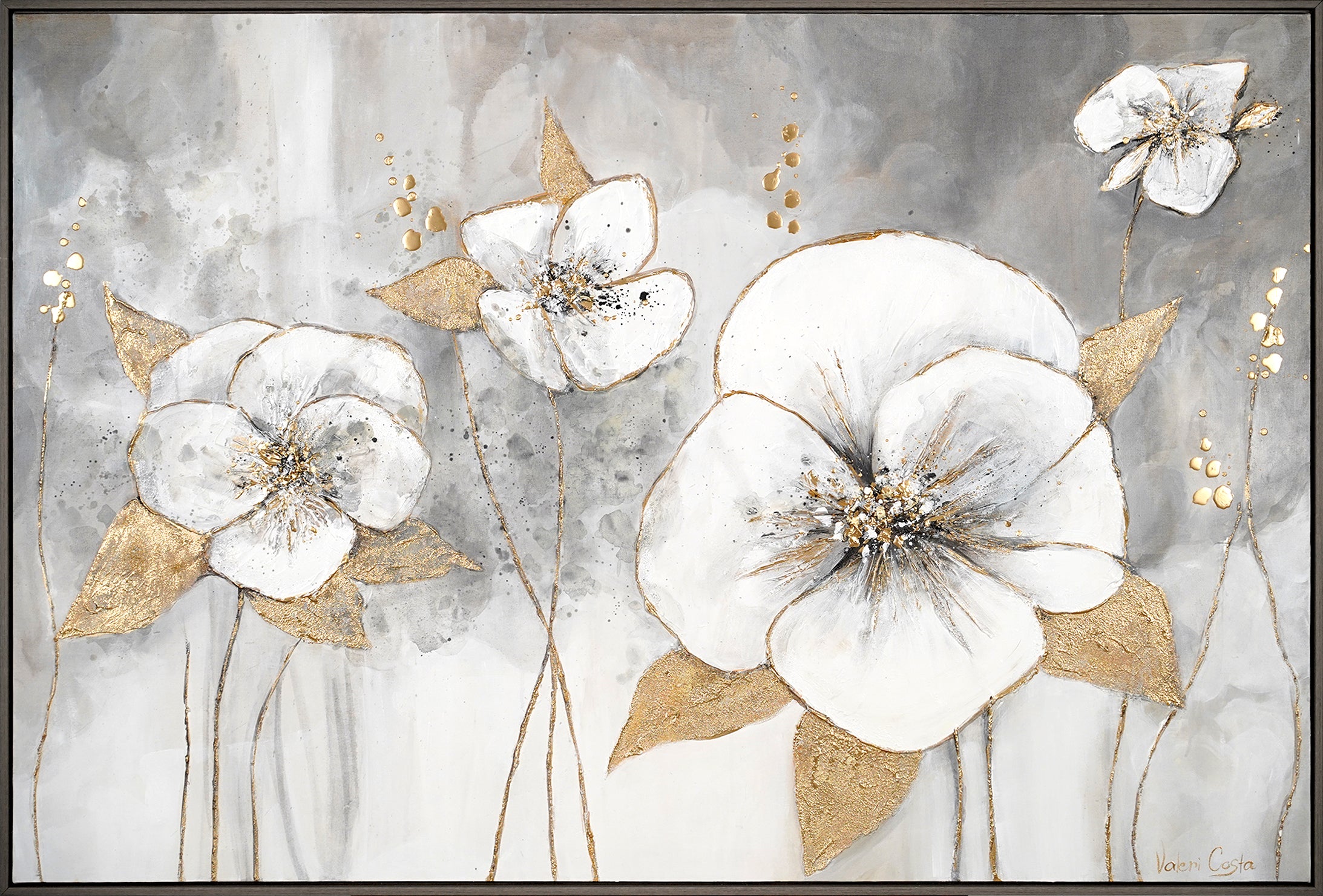 Ervaar florale elegantie in haar mooiste vorm: „Gouden Bloemen” is een handgeschilderd acryl schilderij dat gouden accenten en witte bloemen kunstzinnig combineert op een gestructureerde achtergrond. De plastische bloemvormen steken af tegen de lichtgrijze achtergrond door de metallic gouden tinten en geven het schilderij een moderne, tegelijkertijd tijdloze uitstraling. De compositie is perfect in balans en creëert een rustige, harmonieuze sfeer.