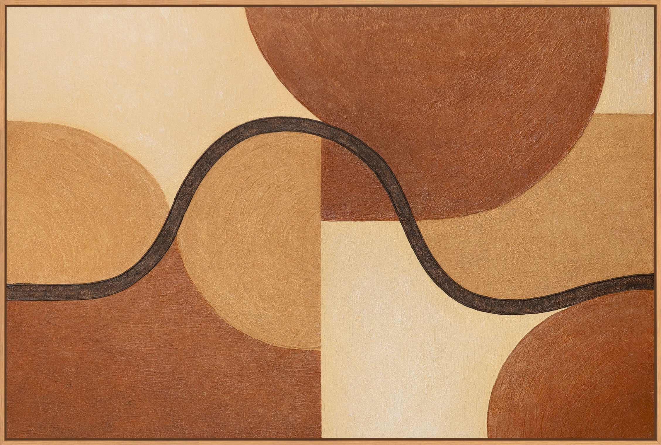 "Verstrengeling van Vormen" is een abstract acrylschilderij met heldere geometrische vormen en vloeiende lijnen. Warme beige, oker en bruine tinten vloeien harmonieus samen en creëren een evenwichtige, serene compositie met een moderne helderheid.