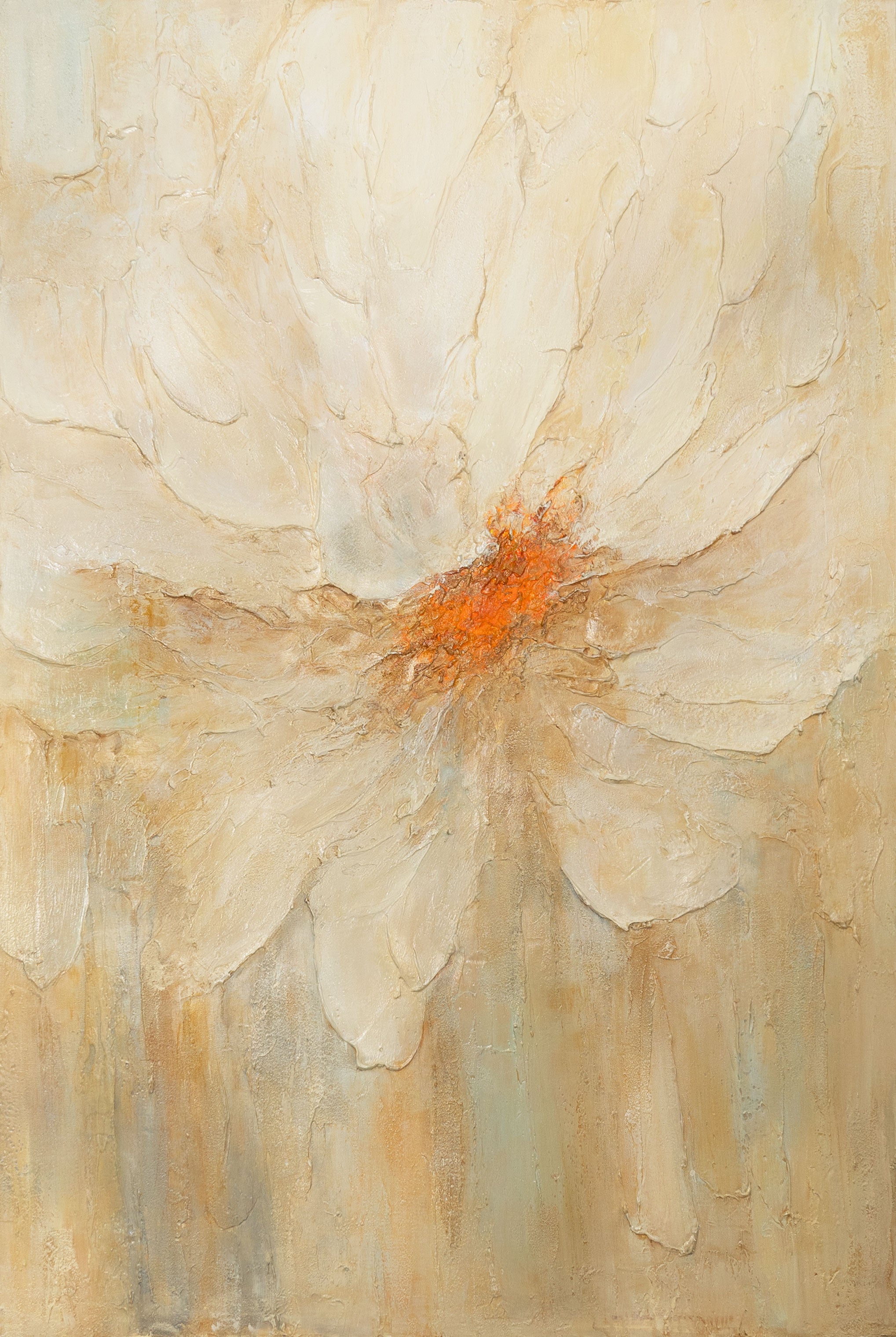 Het acrylschilderij „Vuurstof“ straalt in een fascinerende compositie van zachte crèmekleuren en een fel oranje centrum. De structuur geeft de bloemblaadjes diepte en levendigheid, terwijl de warme tinten de indruk van licht en beweging oproepen.