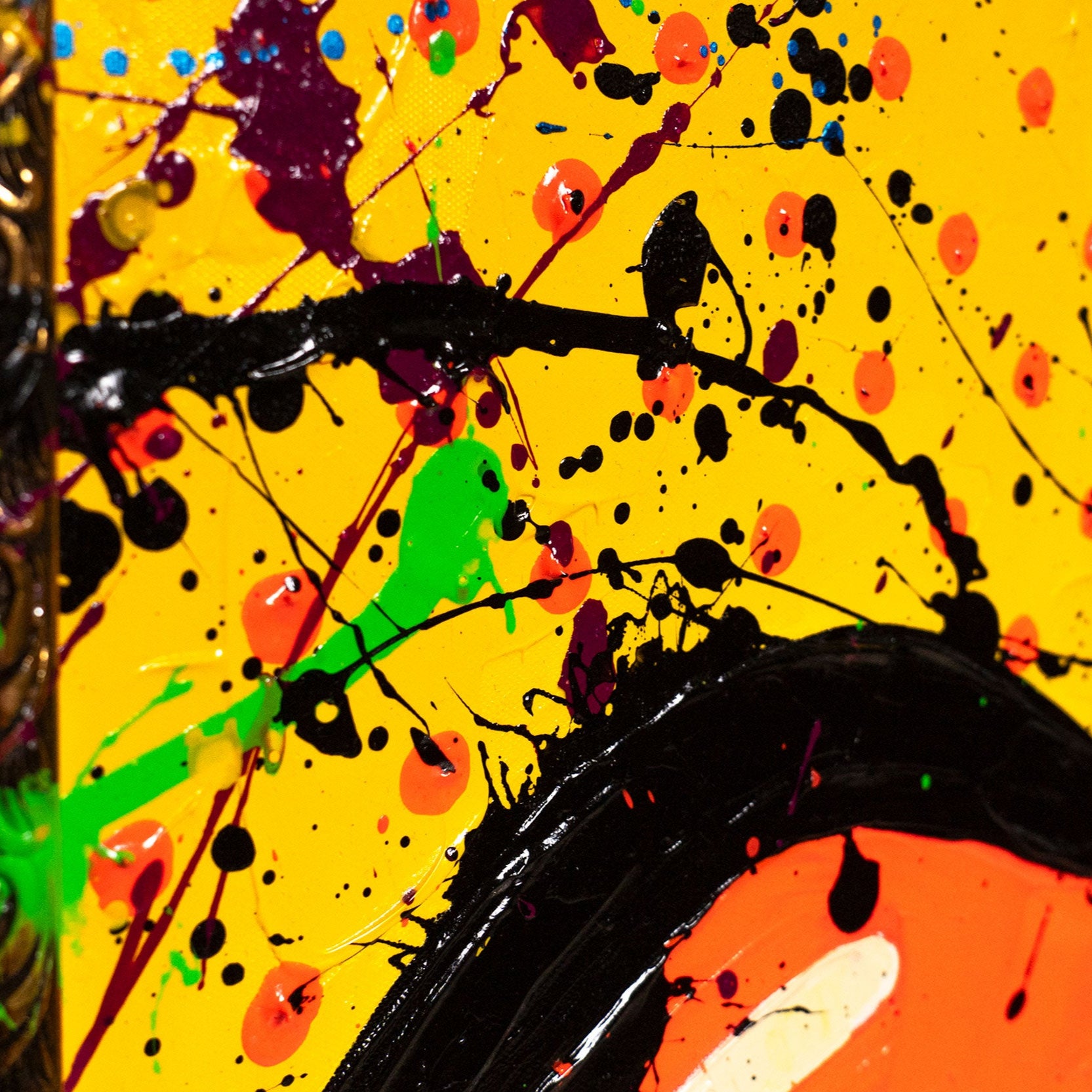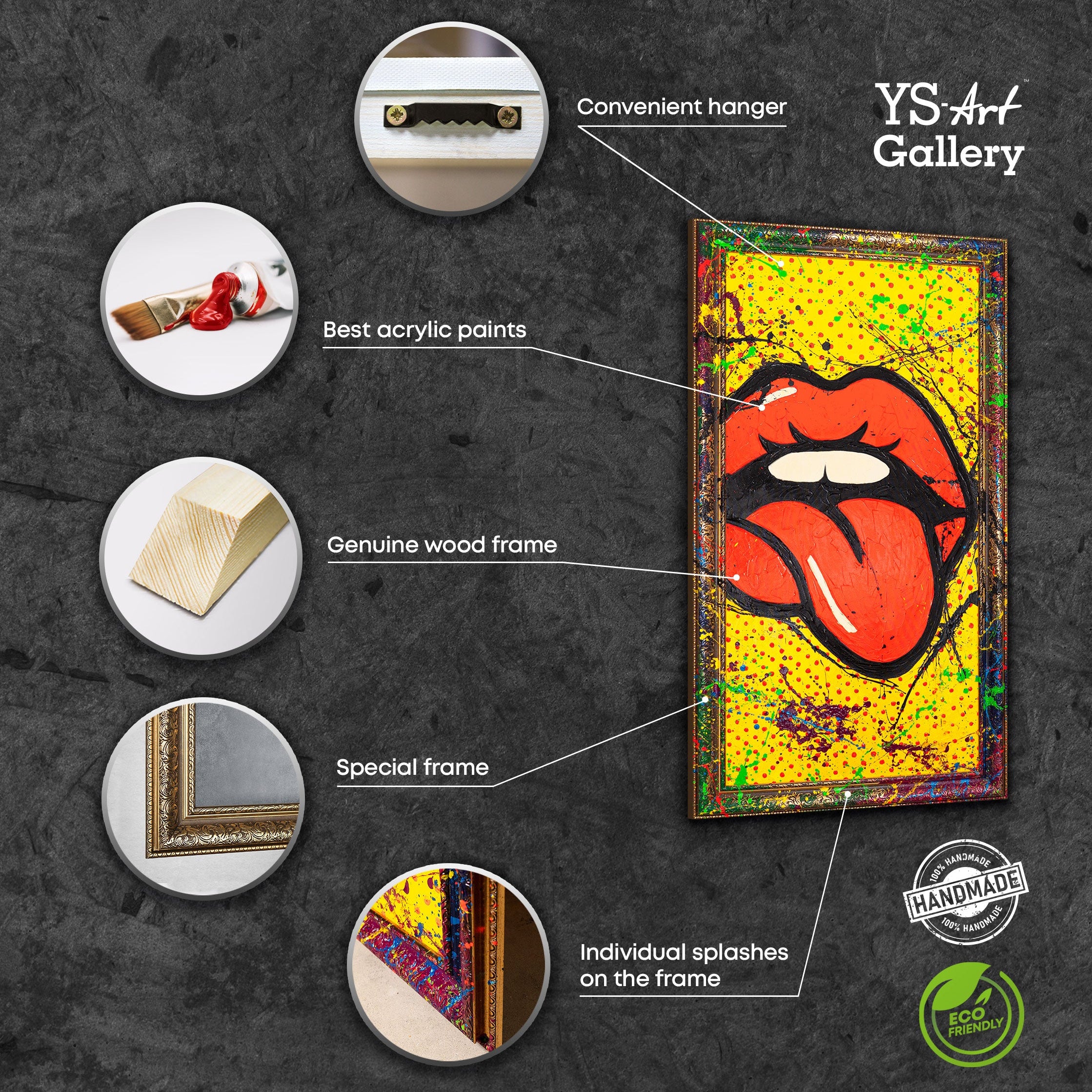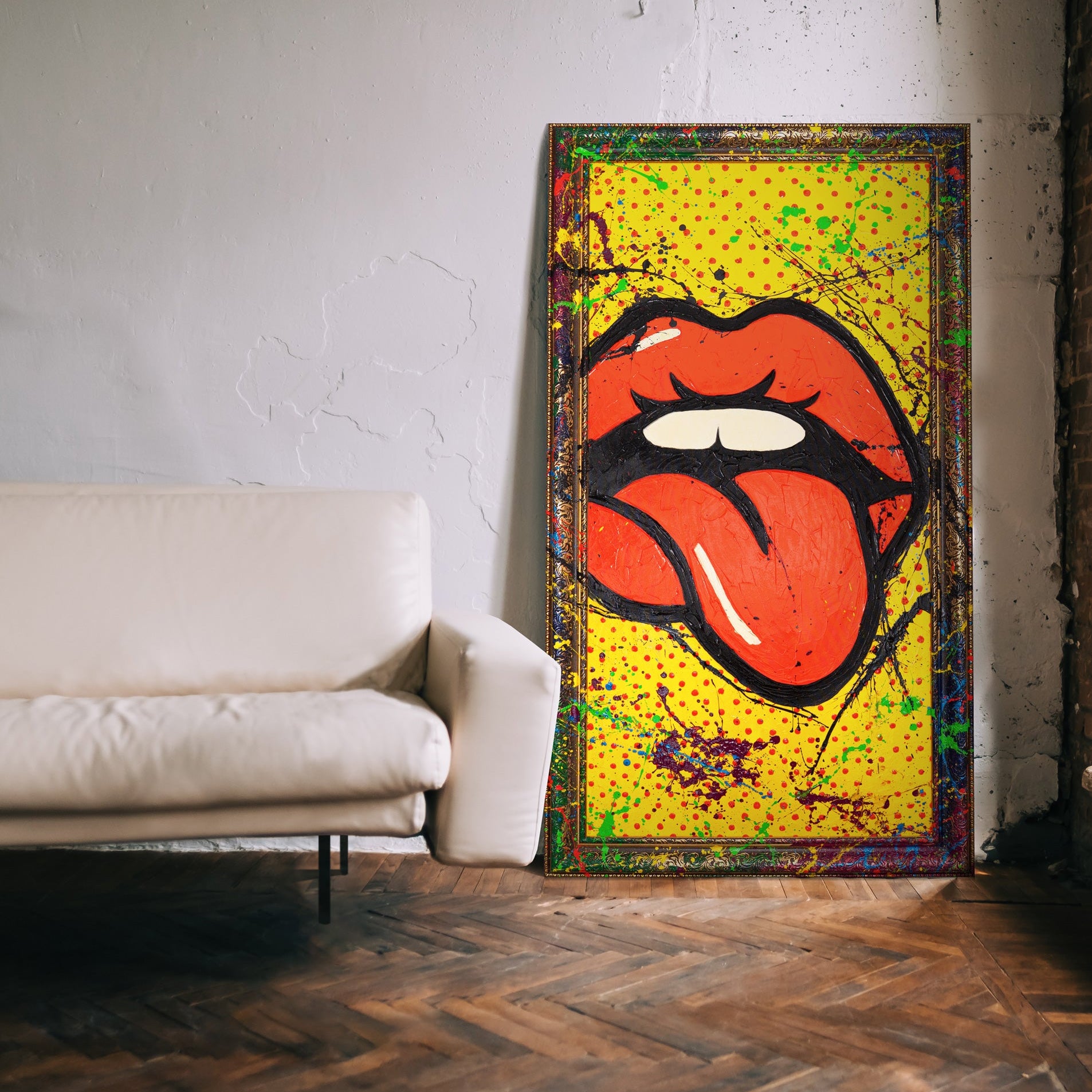 Felle kleuren, pop-art attitude en iconisch ontwerp: Het wandbeeld "WOW" toont rode lippen met een brutale tong in de kenmerkende pop-art stijl. De gele achtergrond met verfspatten en stippen brengt pure energie en urban art gevoel naar elke muur.