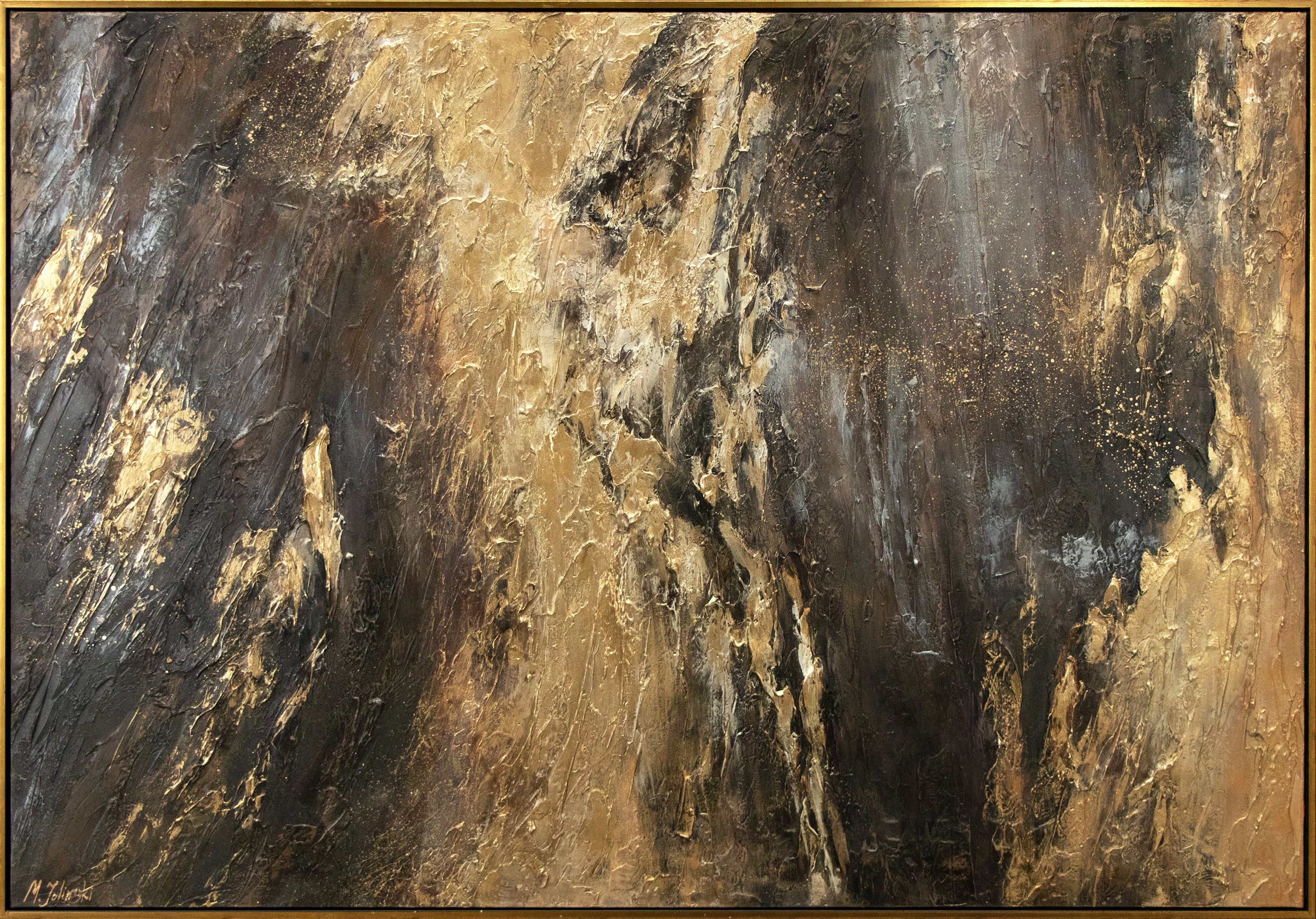 „Reflecties III” is een handgeschilderd acryl schilderij met expressieve structuur in goud, zwart en warme aardetinten. De compositie leeft van dramatische contrasten, intense texturen en de elegante diepte van de kleurlagen. De abstracte dynamiek doet denken aan een krachtige beweging, bevroren in het moment – een kunstwerk dat emoties oproept en ruimte laat voor interpretaties.