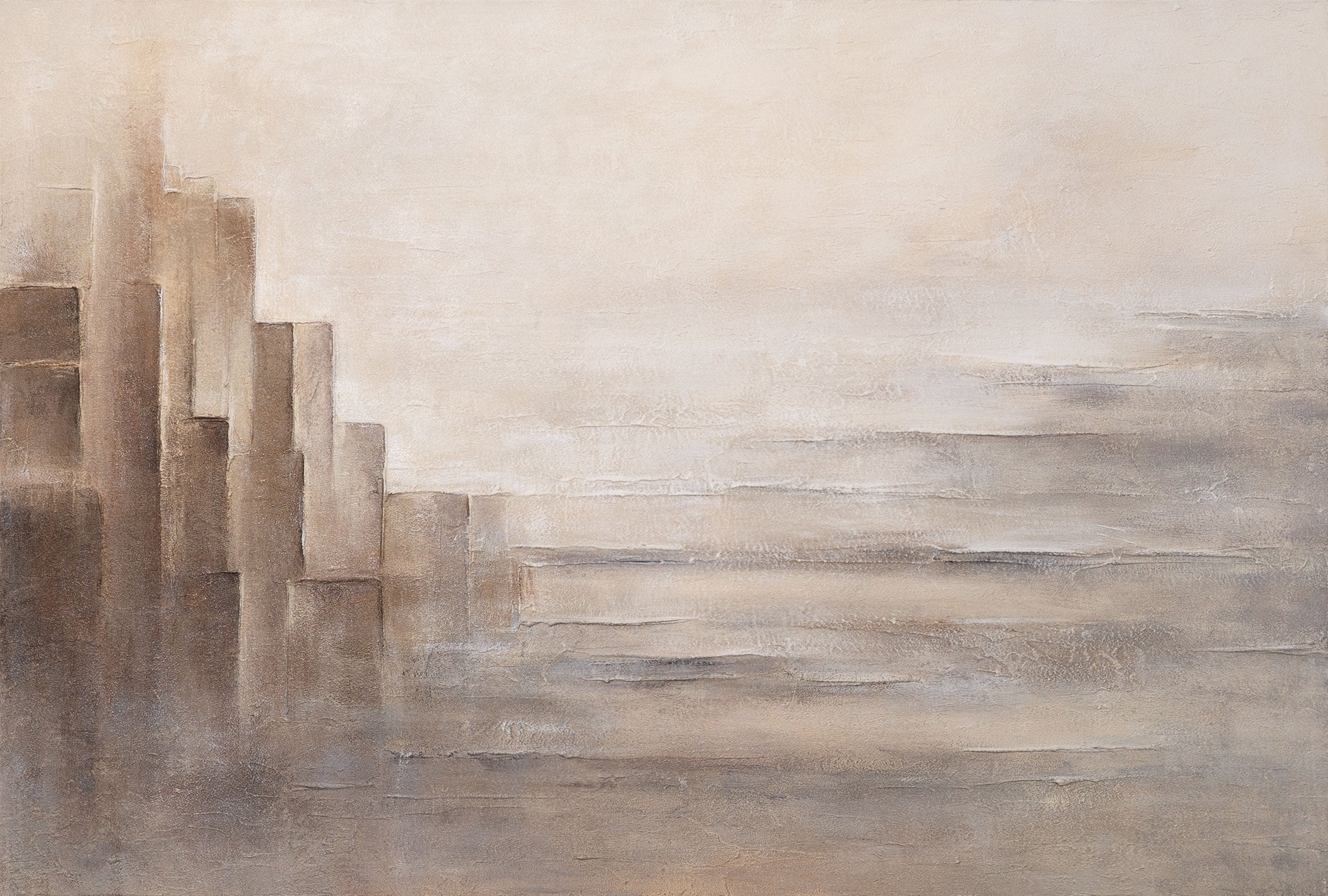 Het handgeschilderde doek „Grenzen der Illusion“ speelt met duidelijke structuren en zachte overgangen. Rechthoekige vormen stijgen op als treden, terwijl zachte beige- en bruintinten overgaan in uitgestrekte vlakken. De compositie wekt de indruk van een stedelijk landschap dat in de verte vervaagt – een mix van architectuur en illusie.