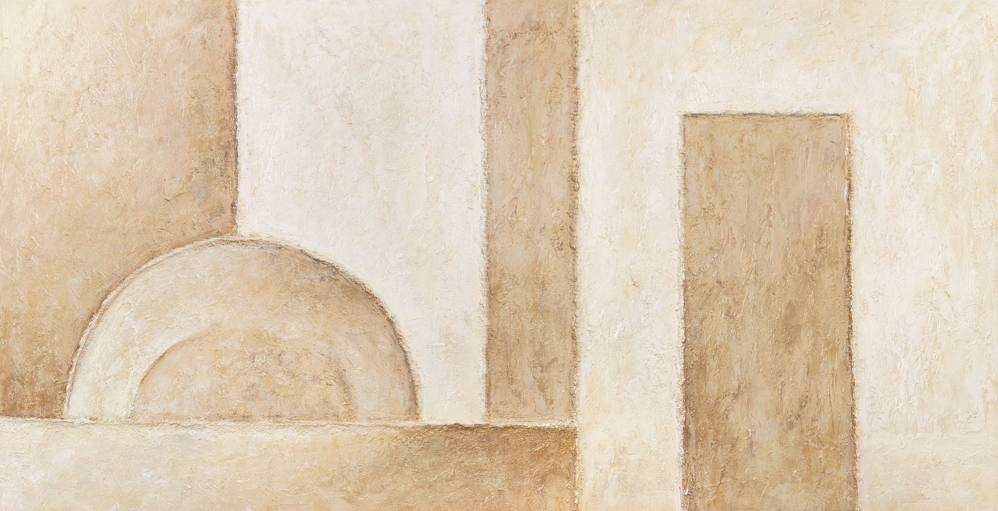 Breng heldere elegantie en architecturale harmonie in uw huis met dit handgeschilderde schilderij. Geometrische vormen in zachte beige en zandtinten verenigen zich tot een moderne, minimalistische compositie die rust en balans uitstraalt.