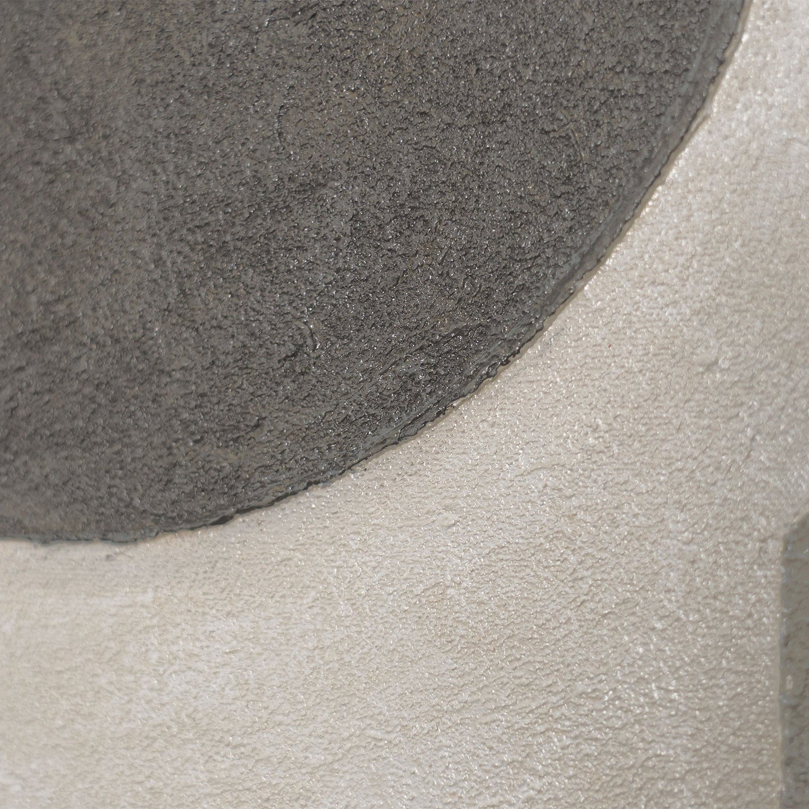 Dit abstracte schilderij boeit met zijn kalme, evenwichtige geometrische compositie en een ingetogen kleurenpalet van warme beige- en grijstinten. Heldere vormen, zachte overgangen en het fijn gestructureerde oppervlak geven het schilderij een meditatieve diepte en benadrukken het handgeschilderde karakter van het acrylwerk.
