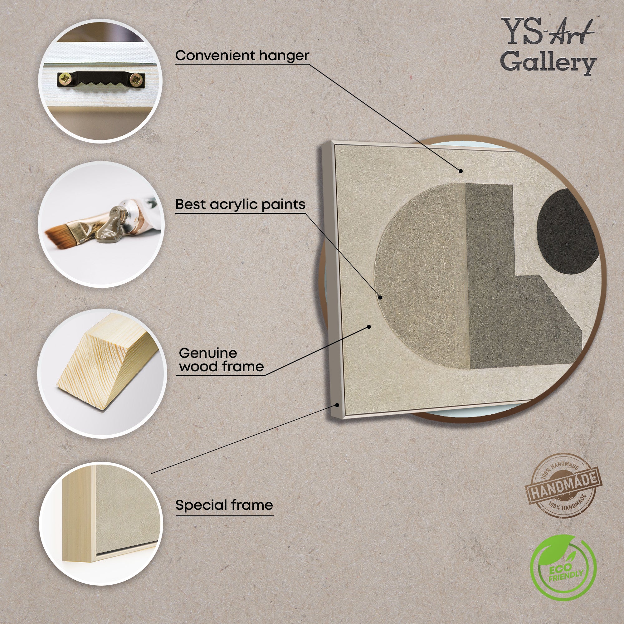 Dit handgeschilderde origineel combineert tijdloze geometrie met moderne ingetogenheid en is ideaal voor iedereen die op zoek is naar rustige, gestructureerde wanddecoratie in een lijst.