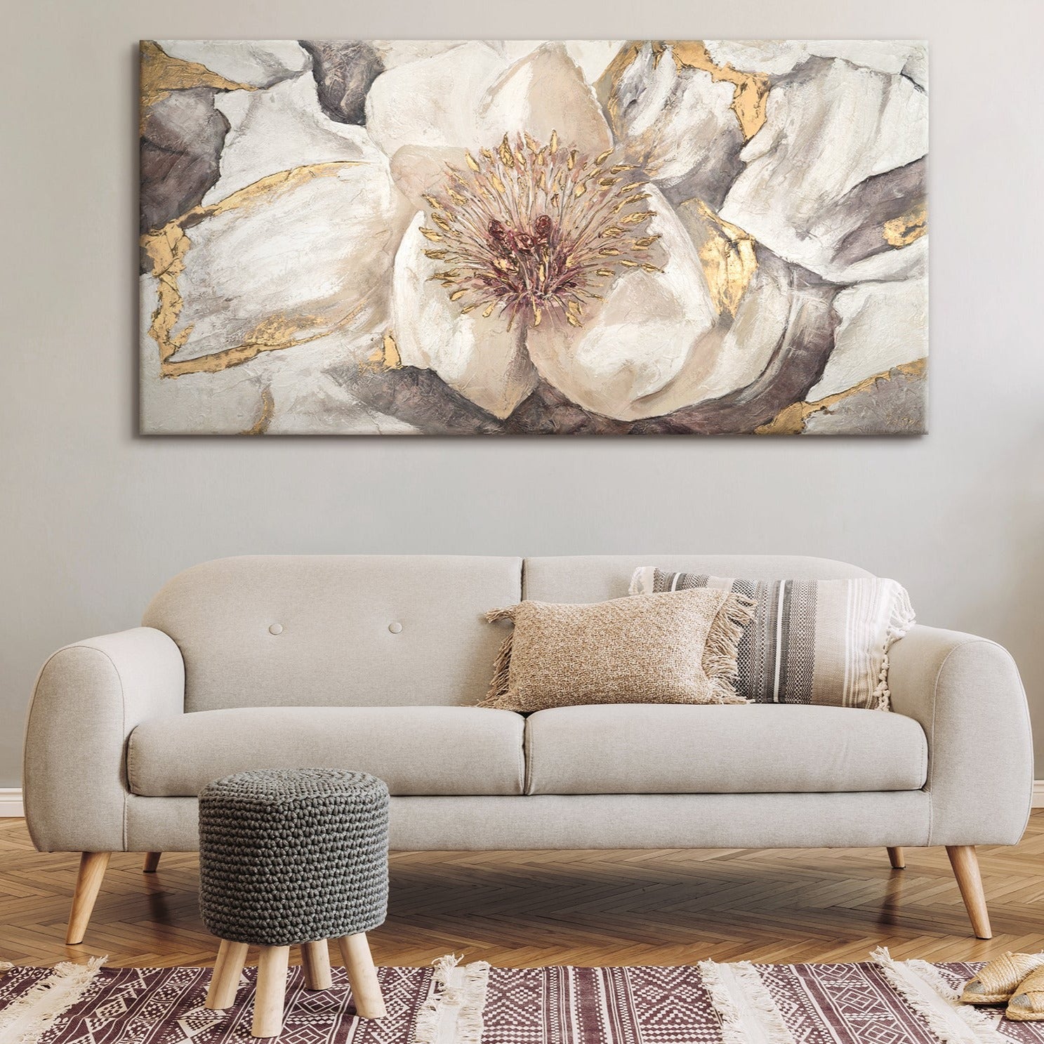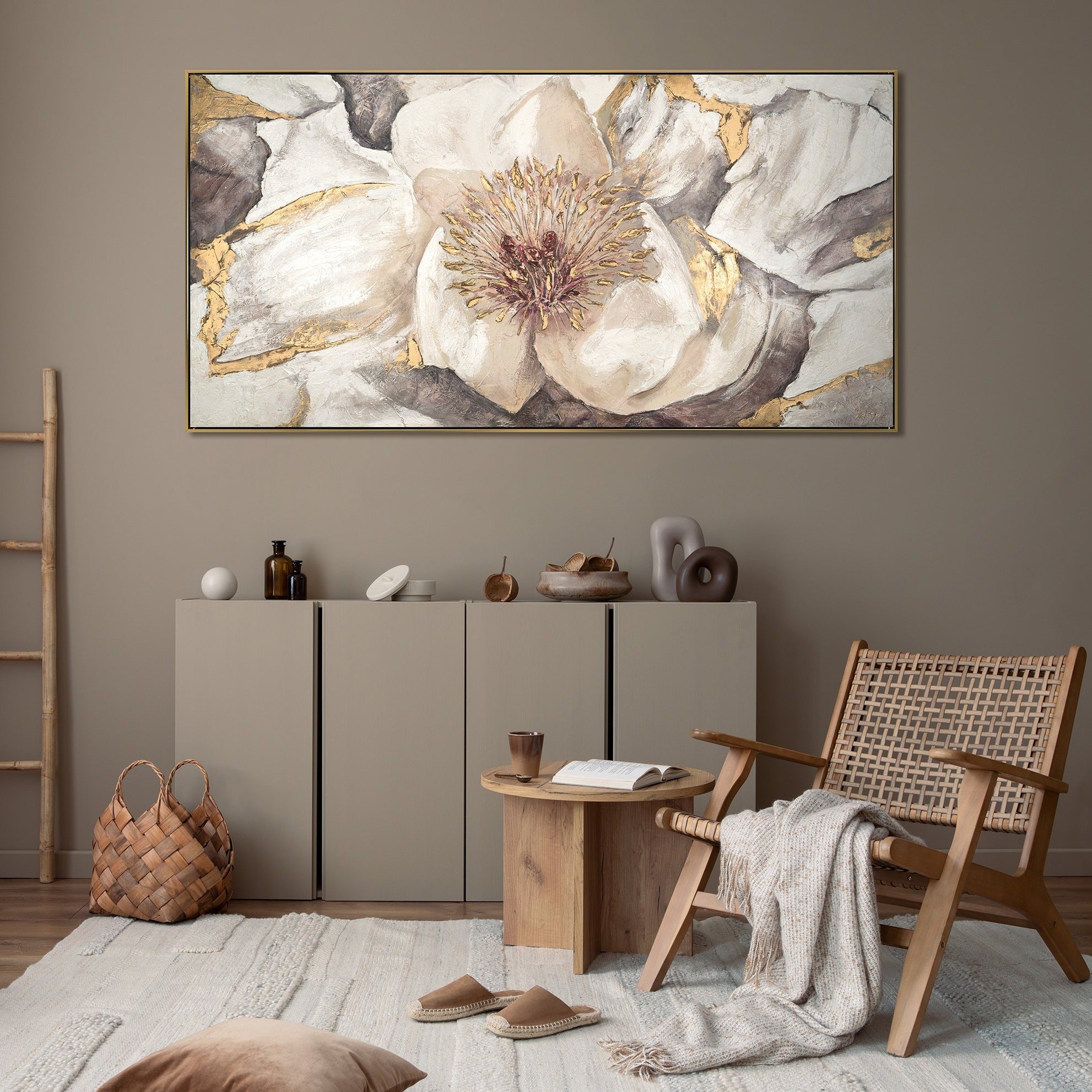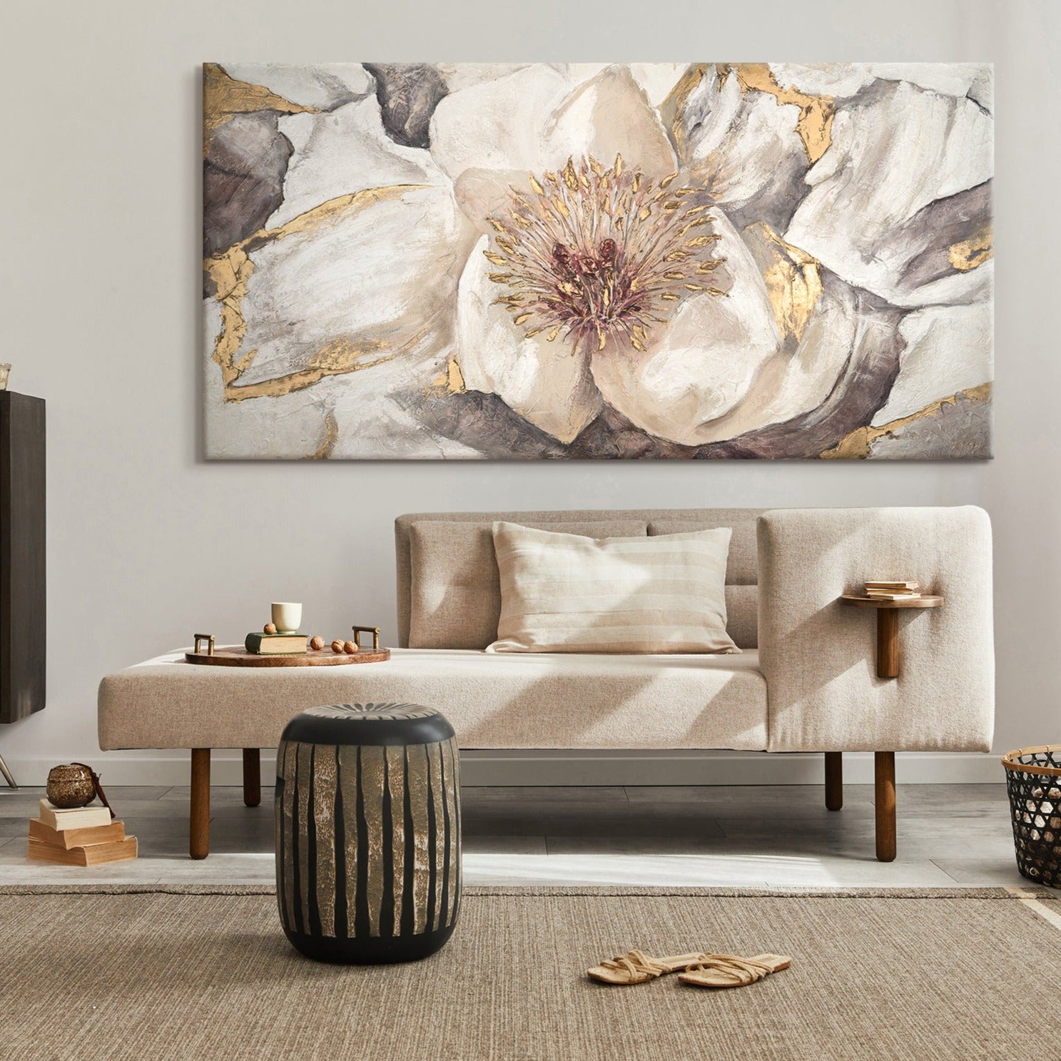Ervaar de uitstekende kunstvaardigheid van dit handgeschilderde bloemen schilderij op canvas. De harmonieuze kleuren en gouden details creëren een elegante en rustgevende sfeer in uw huis. Elk detail van dit kunstwerk is 100% handgemaakt en maakt het tot een uniek stuk. Geniet van gratis levering rechtstreeks naar uw huis.