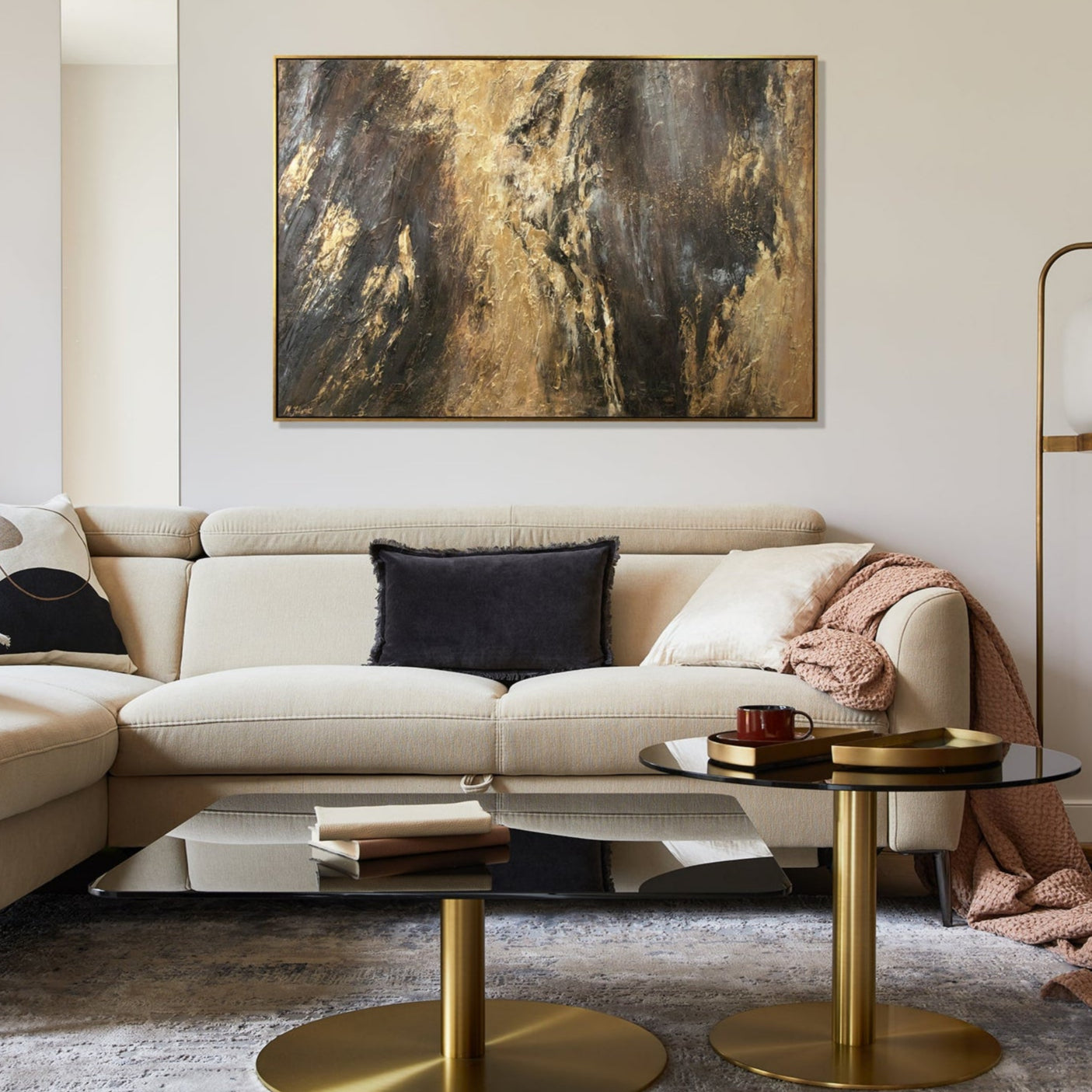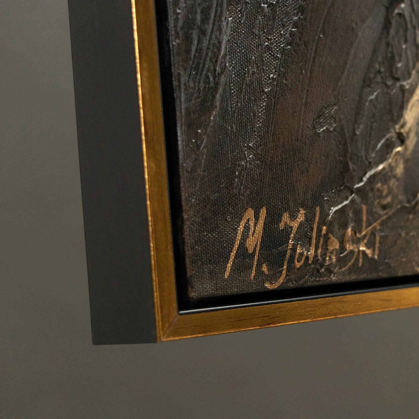 Dieses exklusive handgemalte Acrylbild fasziniert mit einer luxuriösen Kombination aus tiefem Schwarz, Grau und leuchtenden Goldakzenten. Die strukturierte Oberfläche verleiht dem Kunstwerk Tiefe und Eleganz, während der stilvolle Rahmen es perfekt für moderne Wohn- und Arbeitsräume macht.